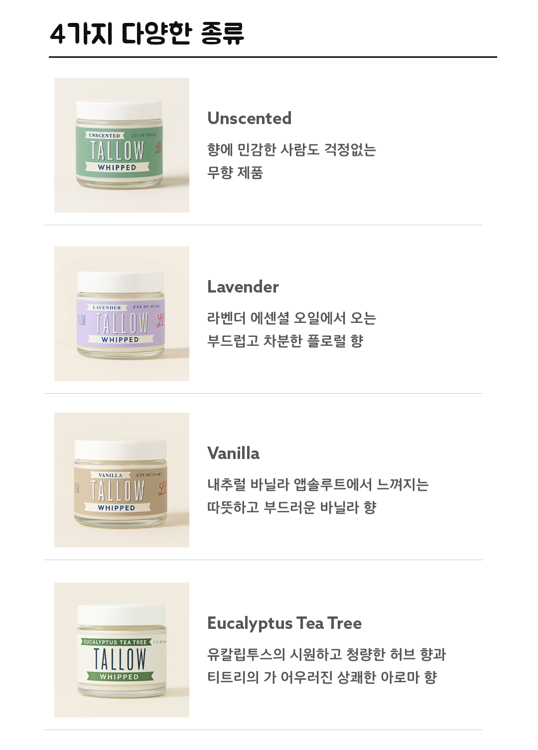 미국 남부의 청정 목장에서 얻은 그라스-페드 비프 타로우를 주 원료로 하여 피부 본연의 힘을 되살리고자 합니다. 타로우는 그라스-페드(풀을 먹고 자란) 소의 지방을 정제해 얻은 순수한 성분입니다. 전통적으로 피부 보호와 치유에 사용되어 왔으며, 인공 첨가물이 없는 자연 그대로의 원료라는 점에서 최근 클린 뷰티 트렌드와 맞닿아 있습니다.