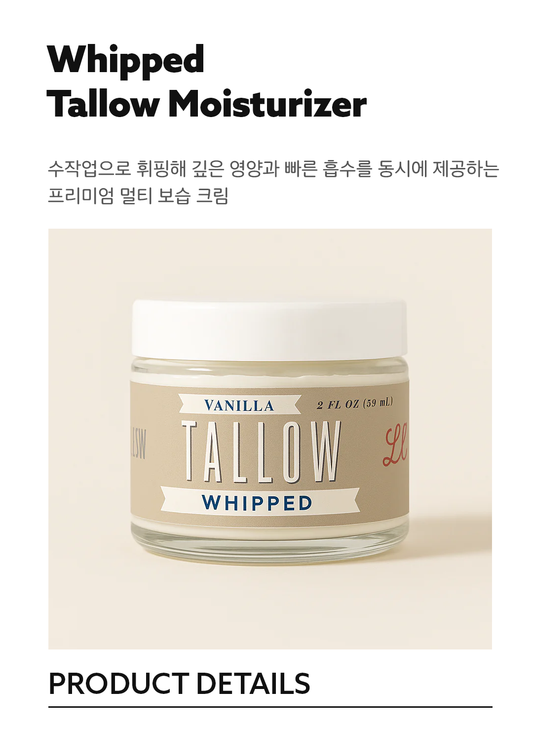 단 하나의 성분, 100% 목초 사육 쇠고기 타로우만으로 만들어진 가장 순수한 형태의 모이스처라이저입니다.
