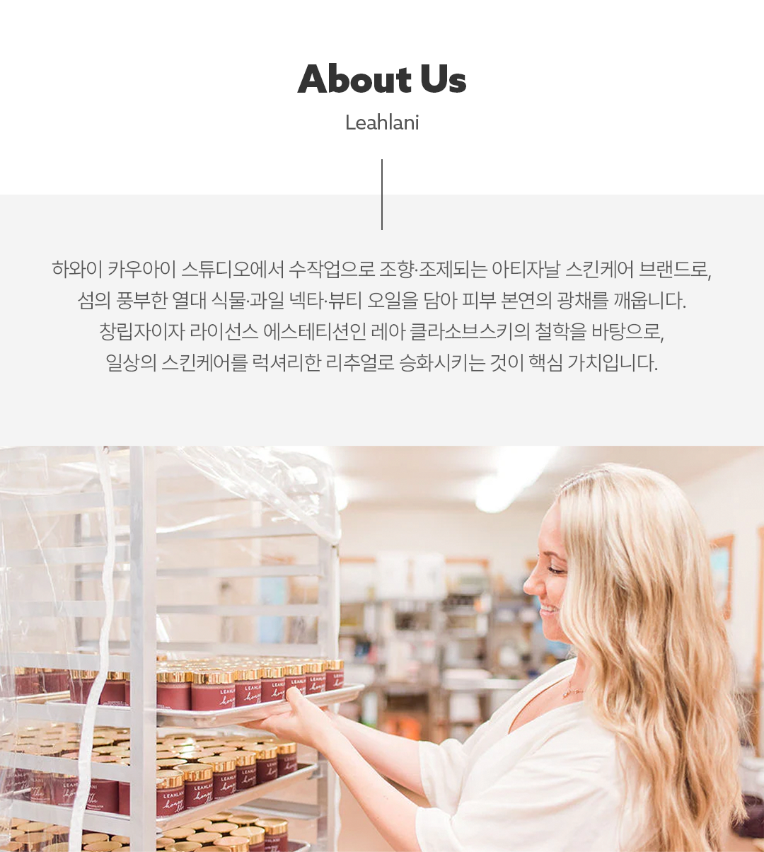 모든 제품은 하와이에서 소량 생산 방식으로 제작되며, 신선한 식물성 오일과 추출물, 그리고 피부 균형을 돕는 자연 성분을 정성스럽게 블렌딩하여 제조합니다.