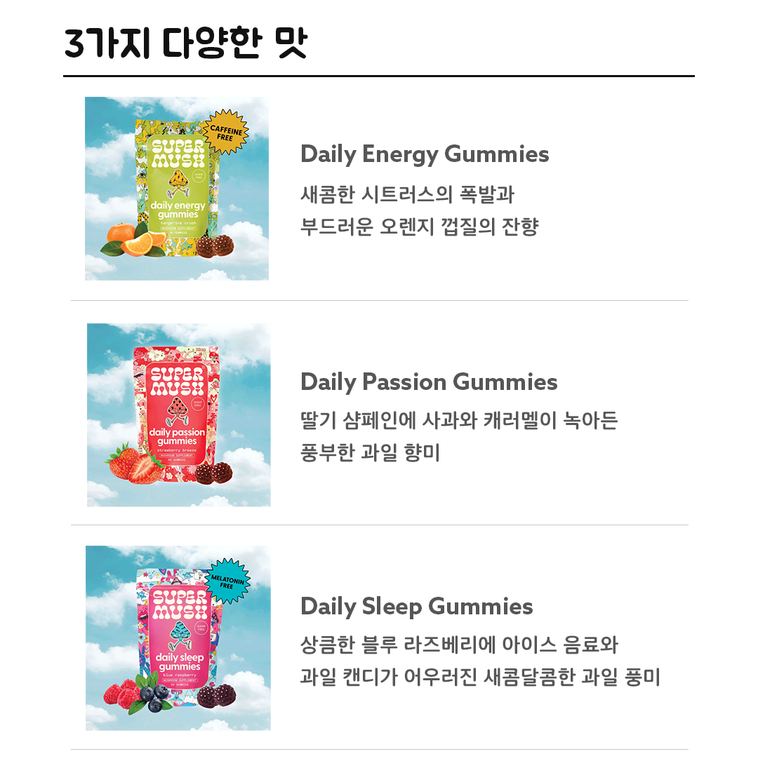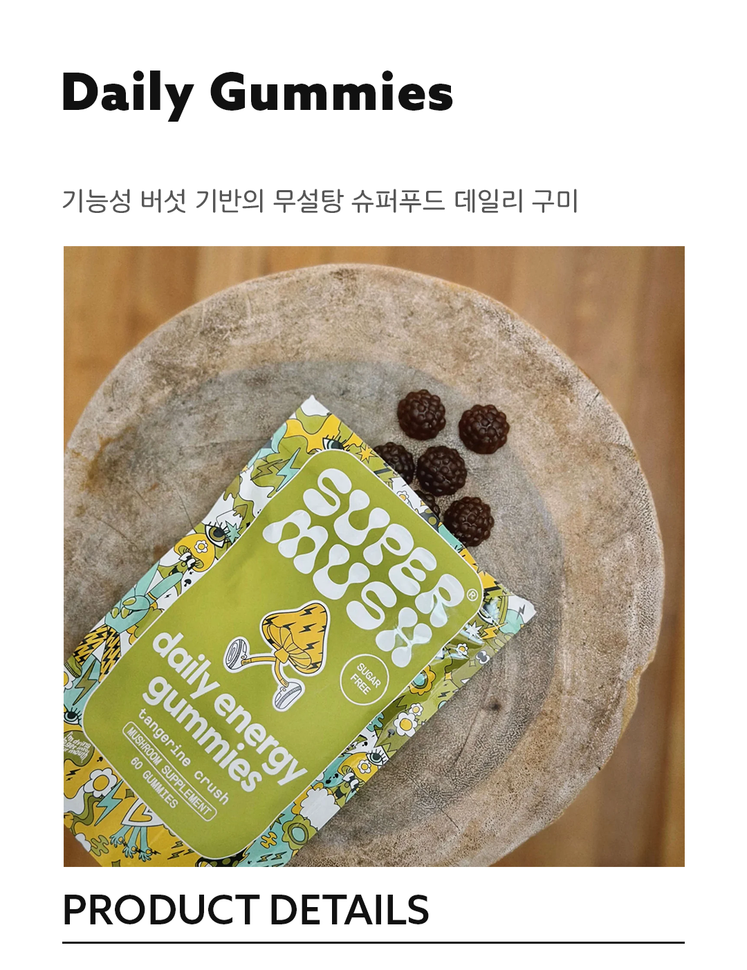SuperMush Daily Mushroom Gummies는 맛있게 씹으며 똑똑하게 건강을 챙기는 현대인을 위한 데일리 버섯 웰니스 솔루션입니다.