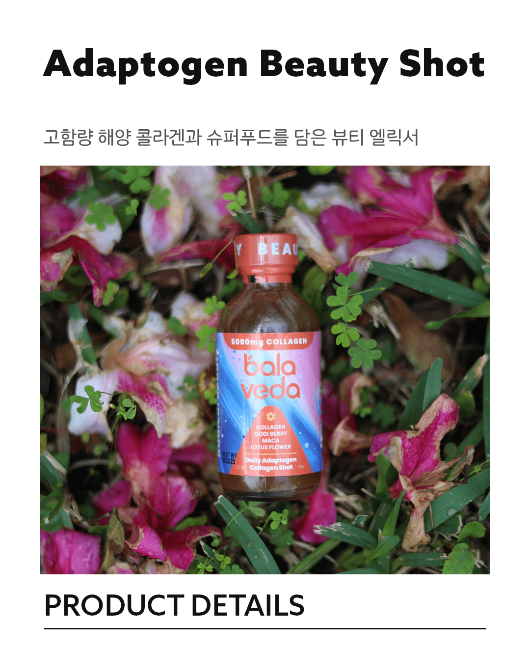 한 병에 5,000mg의 해양성 콜라겐과 아유르베다 성분을 비롯한 다양한 슈퍼푸드를 담아 피부와 건강을 함께 케어할 수 있도록 설계되었습니다.