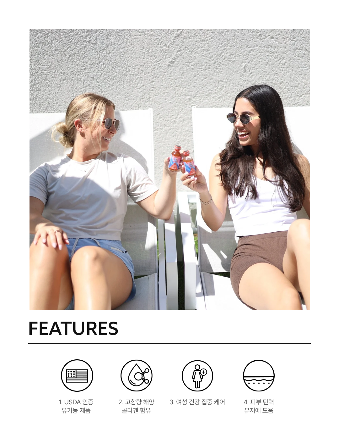 미국 현지에서 소량 생산되는 프리미엄 비건 뷰티 샷으로 모든 원료는 GMO·글루텐·설탕·인공향·색소·보존료 없이 엄격하게 선정된 천연 식물성만을 사용해 만들어집니다.