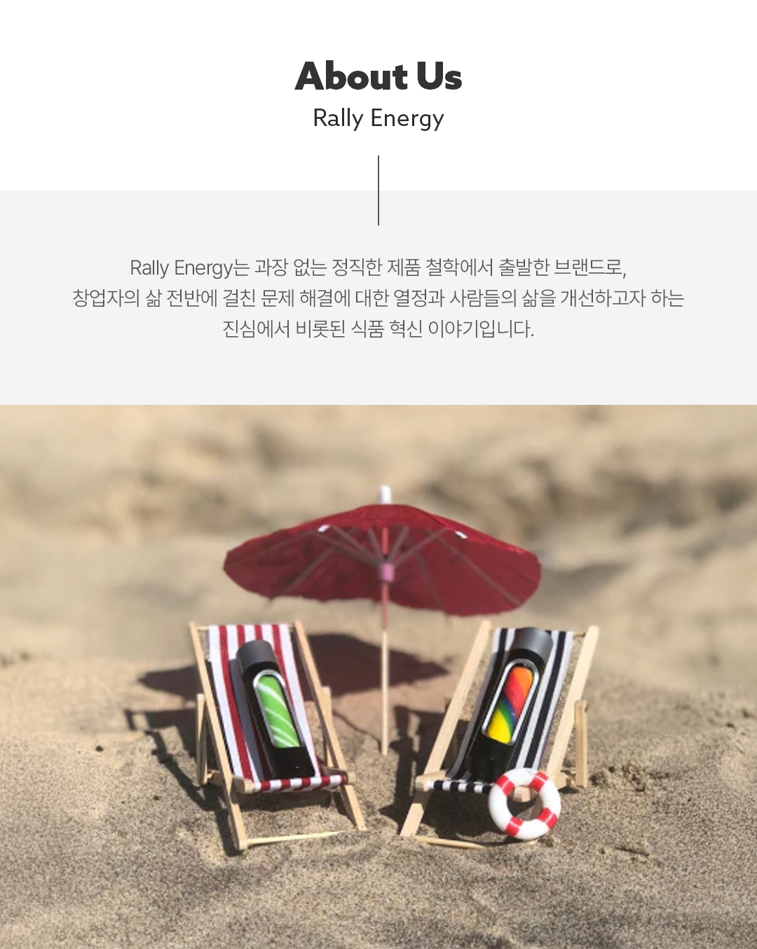 기존 에너지 드링크의 부피감과 설탕 과다, 커피의 불편함을 해결하고자 탄생한 Rally Energy는 과장된 마케팅이나 불필요한 첨가물 없이 오직 효과적인 기능성 성분만을 사용하는 것을 원칙으로 합니다.