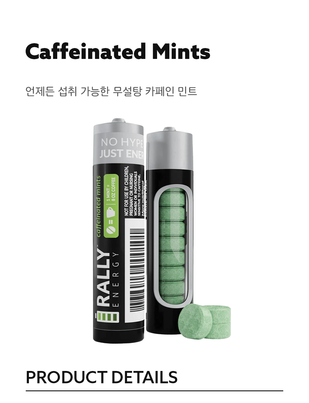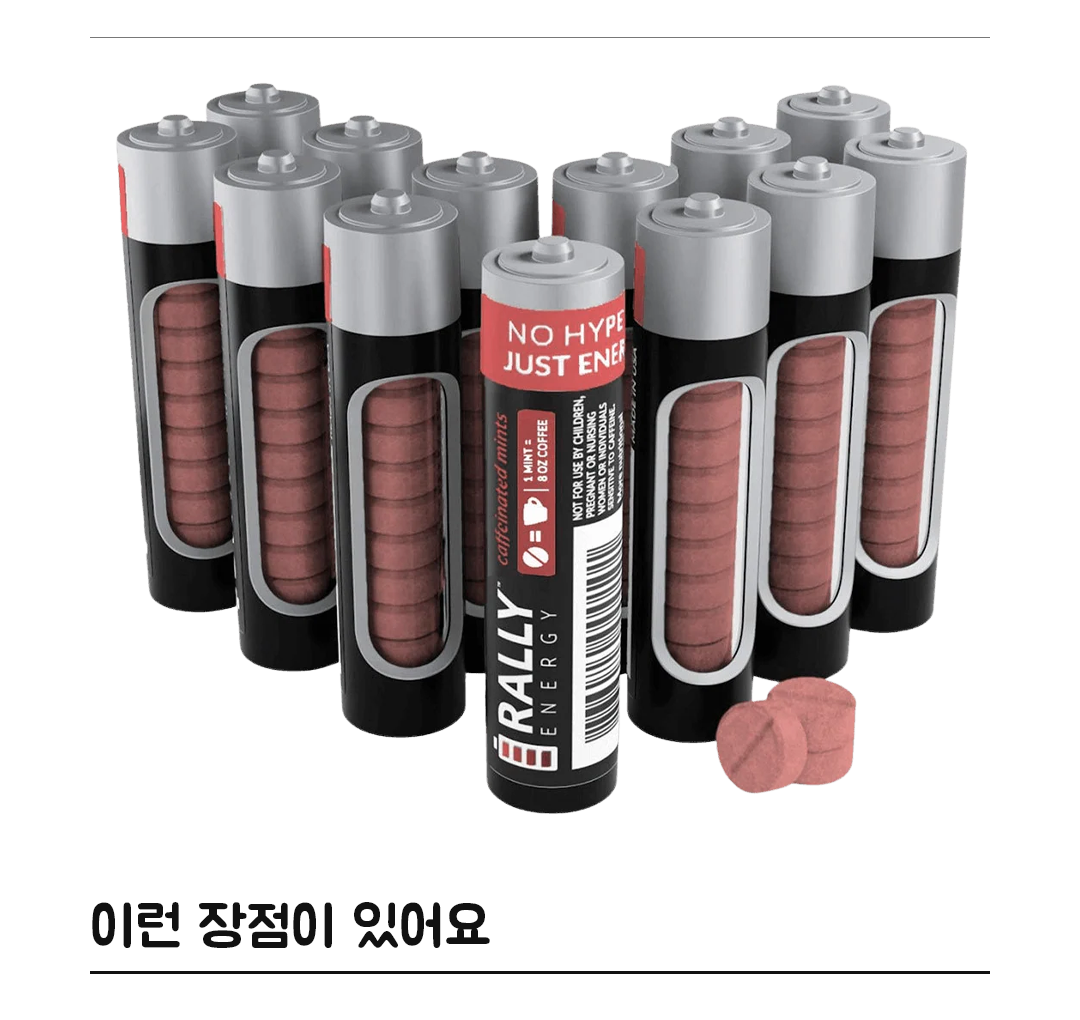 Rally Energy Mints는 입안에서 빠르게 녹아 즉각적인 카페인 공급과 상쾌한 구강 상태를 동시에 제공하는 프리미엄 에너지 민트입니다.