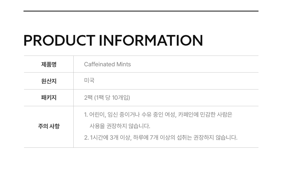각각의 민트에 60mg 카페인과 아미노산 글리신이 함유되어 있으며, 설탕과 인공 첨가물이 없어 부담 없이 사용 가능합니다.