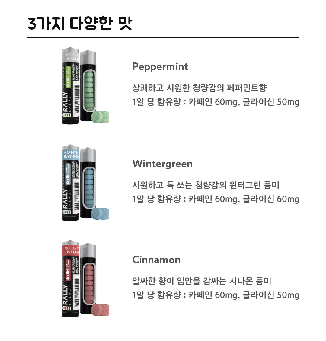 3가지 다양한 맛으로 제공되며 동일한 60mg 카페인과 50mg 글리신을 함유하여 효과는 동일하여 개인의 취향에 따라 선택할 수 있습니다.
