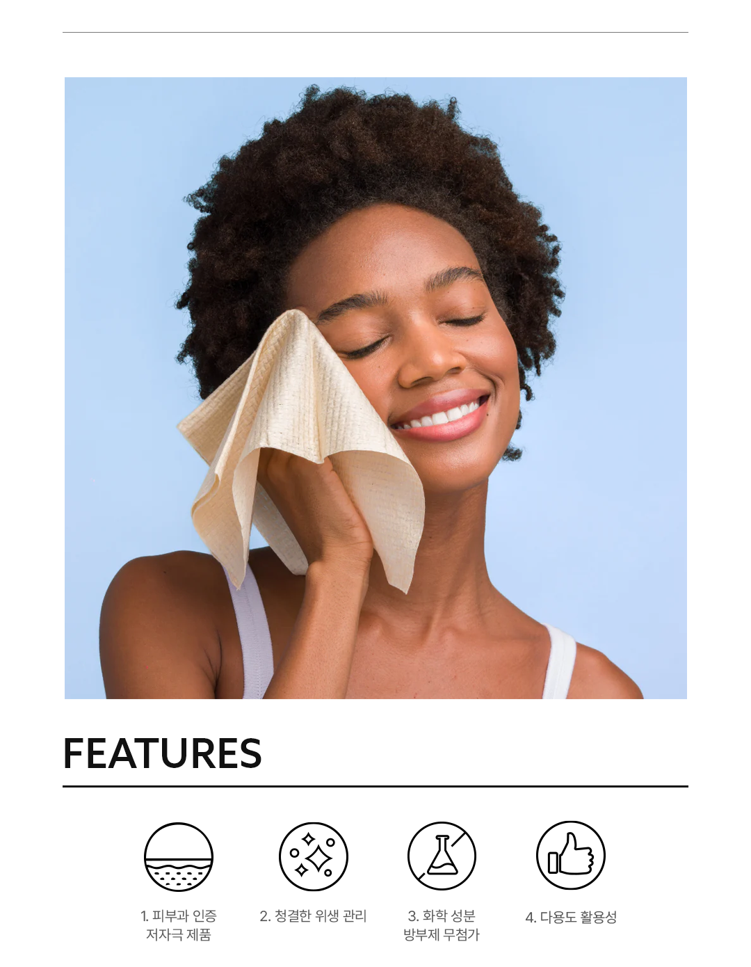 100% USDA 바이오 기반(유기농 대나무 비스코스) 소재로 만들어져, 피부 자극을 줄이고 더 깨끗한 스킨케어 루틴을 가능하게 합니다.