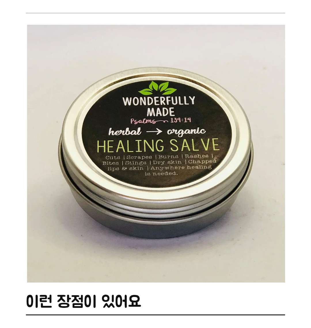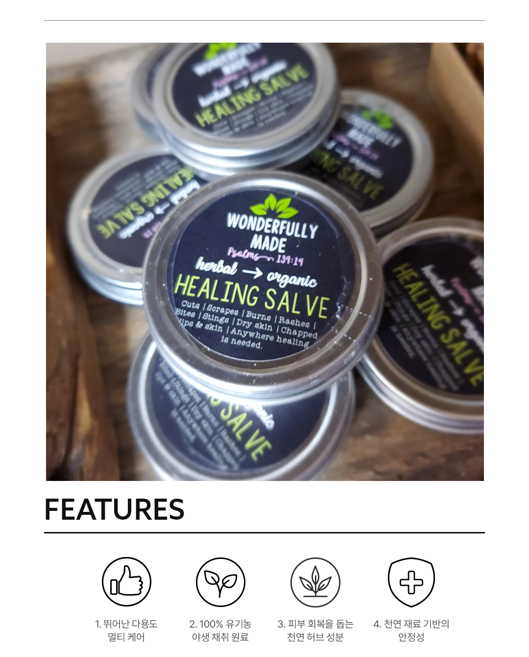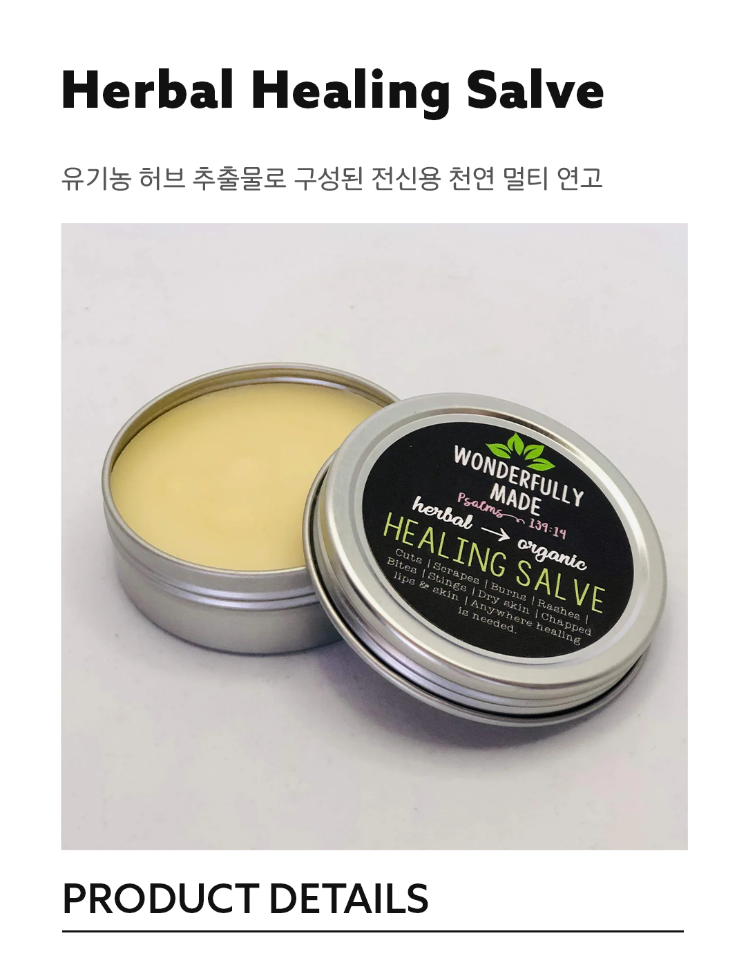 자연의 허브로 피부를 부드럽게 감싸주는 Herbal Healing Salve는 작은 상처부터 건조한 부위까지 전천후로 사용할 수 있는 천연 치유 연고입니다.