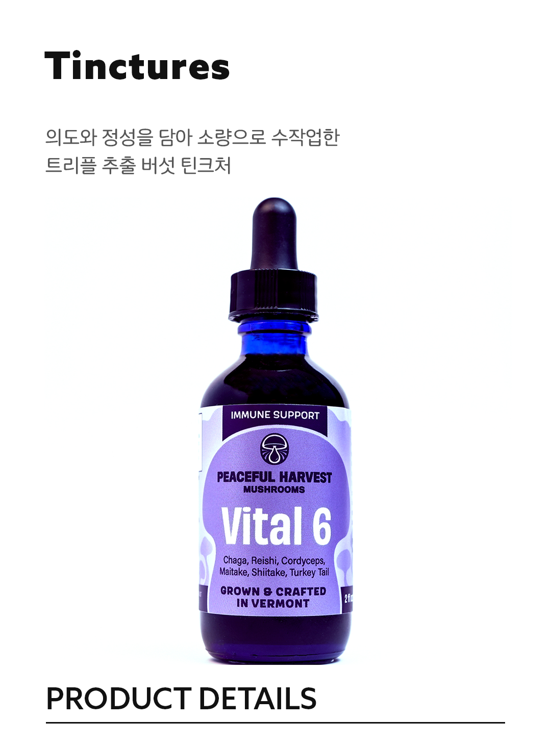 Peaceful Harvest의 틴크처는 각 버섯의 특성을 살린 트리플 혹은 더블 추출 방식으로 만든 액상 형태의 약초 보조제입니다. 정신 건강, 면역력, 에너지, 호르몬 균형 등 다양한 건강 목적에 따라 선택할 수 있으며, 모두 소비자 친화적으로 섭취가 간편하고, 믿을 수 있는 포뮬라를 강조합니다. .