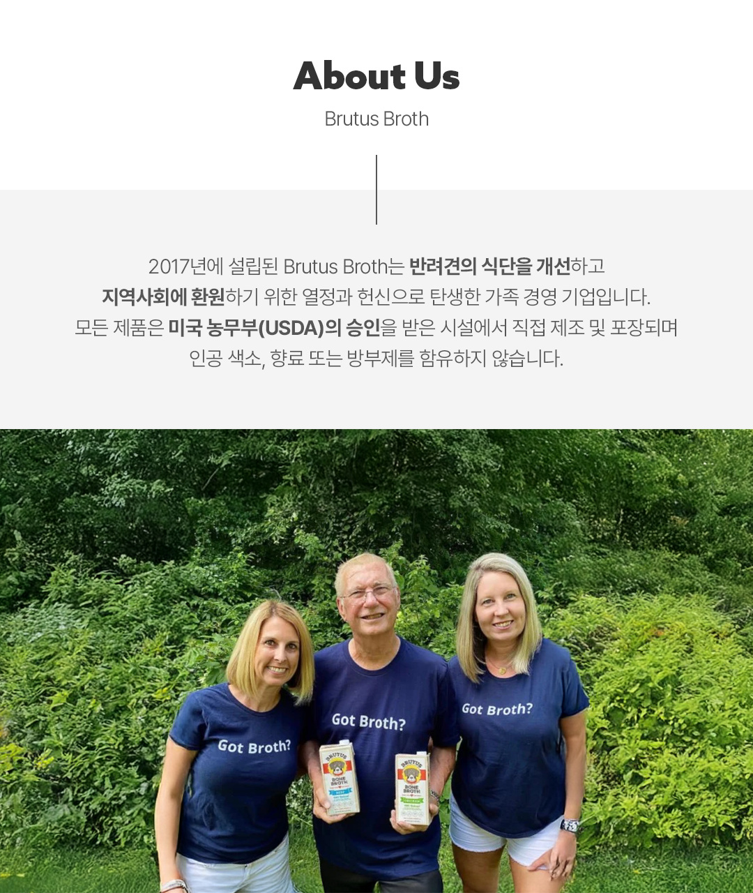 자매의 헌신과 사랑, 그리고 최고의 품질에 대한 약속이 만들어낸 Brutus Broth는 오늘도 전 세계 반려동물 가족들의 특별한 순간을 더욱 건강하고 맛있게 만들어가고 있습니다.