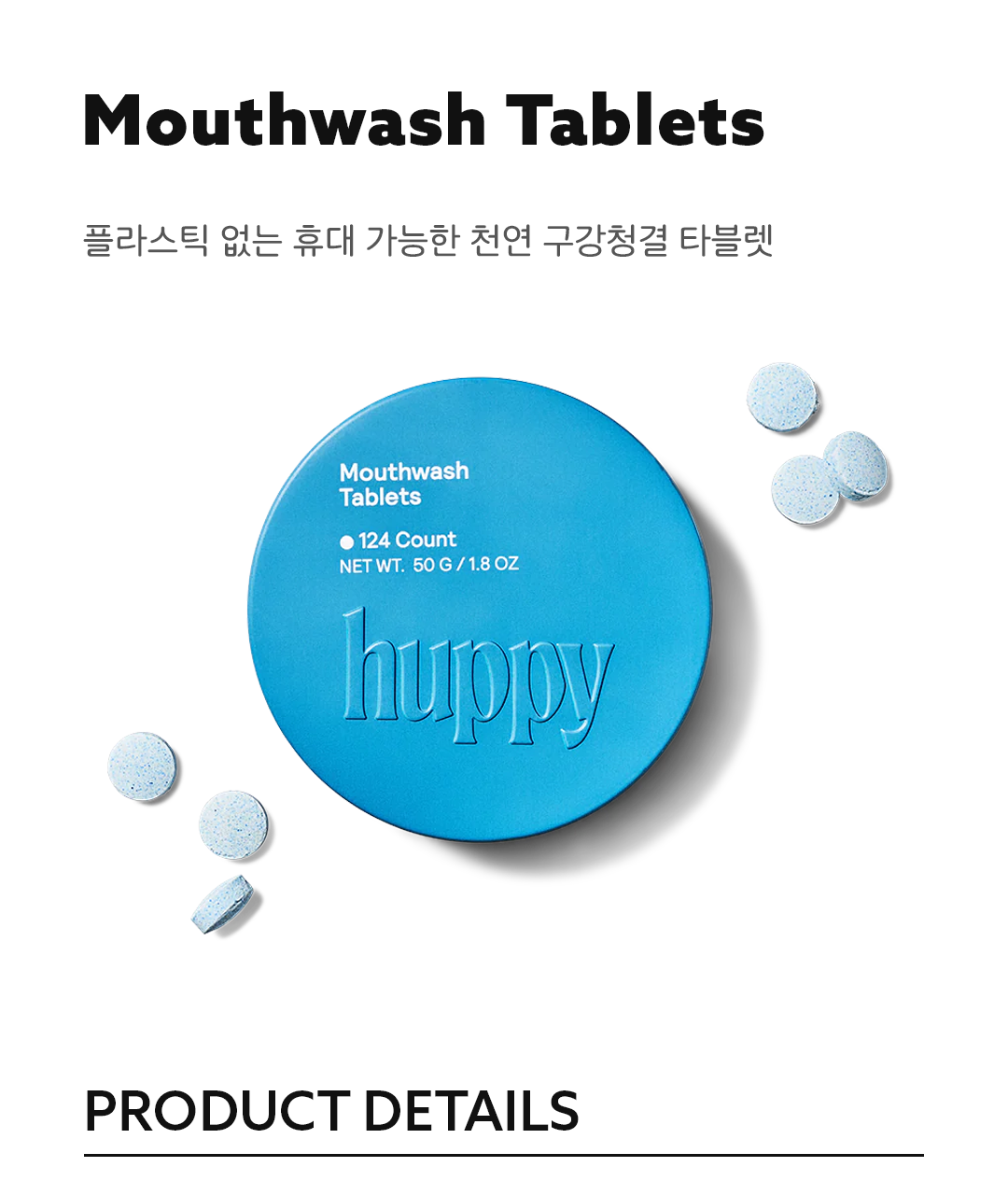 Huppy의 Mouthwash Tablets는 기존의 플라스틱 병 가글을 혁신적인 타블렛 형태로 재탄생시킨 친환경 구강케어 제품입니다.
