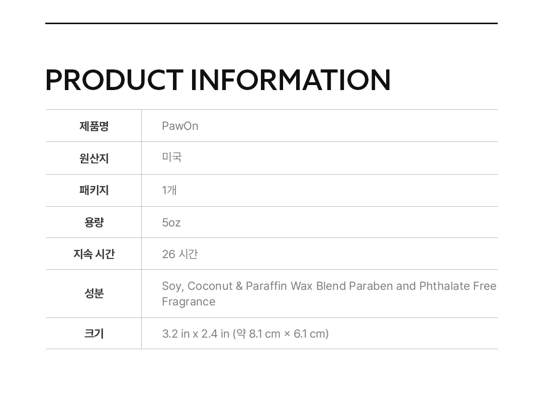 각 Pawson 캔들은 26시간 연소 시간의 5온스 용량으로 오랫동안 사용할 수 있으며, 집안 전체에 은은하게 퍼지는 향으로 반려동물과 함께하는 공간을 더욱 쾌적하게 만들어줍니다.