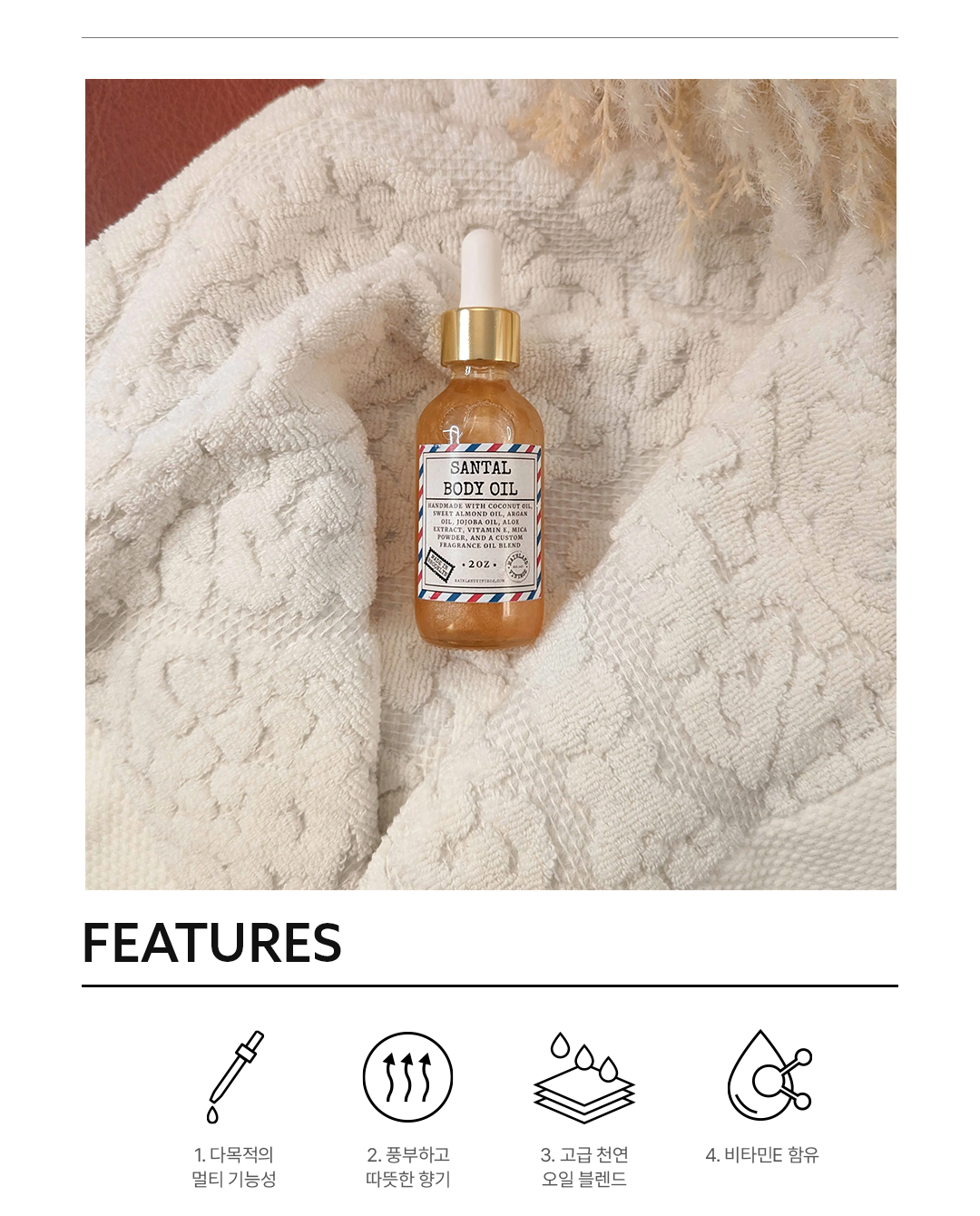 자연 유래 오일을 사용해 피부에 빠르게 흡수되고, 보습과 영양, 그리고 향이 오랫동안 부드럽게 남아 피부 본연의 건강함과 윤기를 더해줍니다.