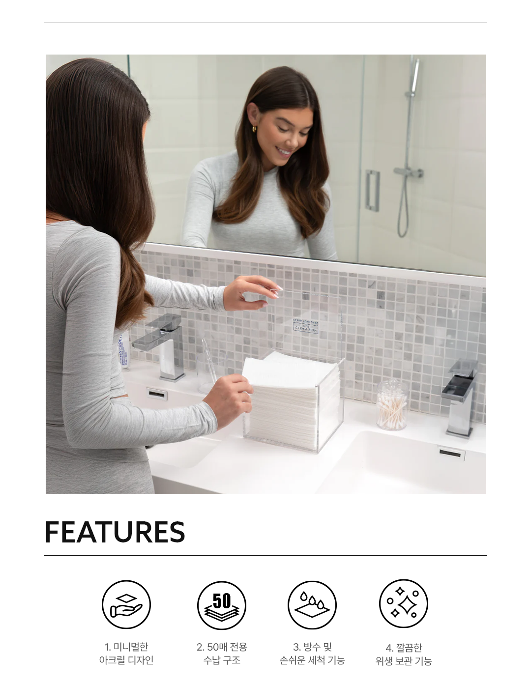 고품질 투명 아크릴 소재로 제작되어 마치 공중에 떠 있는 것처럼 보이는 환상적 효과를 연출하면서도, Clean Towels XL 50매를 완벽하게 보관하는 실용성을 겸비한 세련된 보관 솔루션입니다.