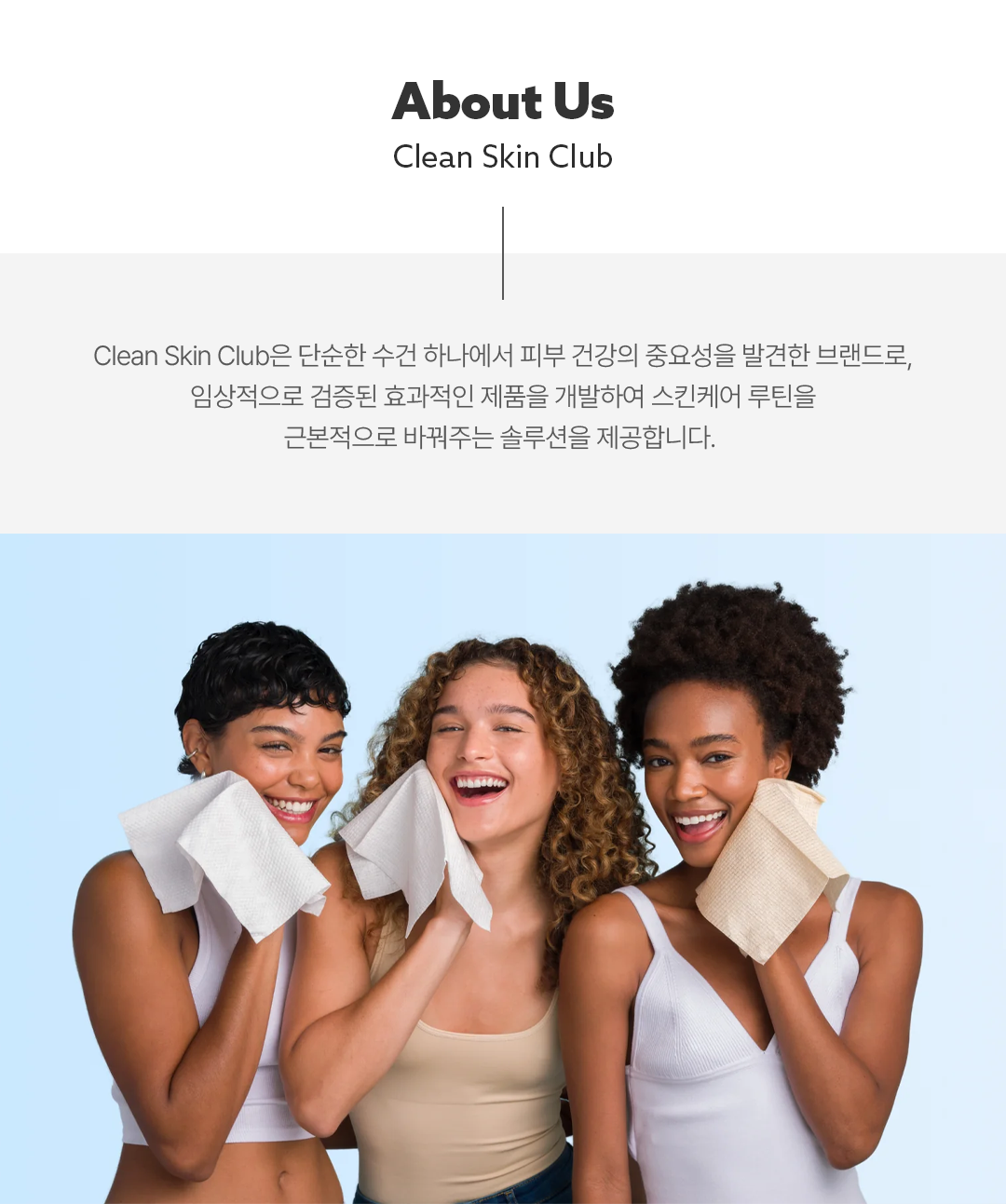 2019년 설립된 Clean Skin Club은 스킨케어 업계의 공허한 약속들에 실망한 창립자들이 "건강한 피부는 매일 사용하는 수건부터 시작된다"는 단순하지만 혁신적인 통찰에서 출발한 브랜드입니다.