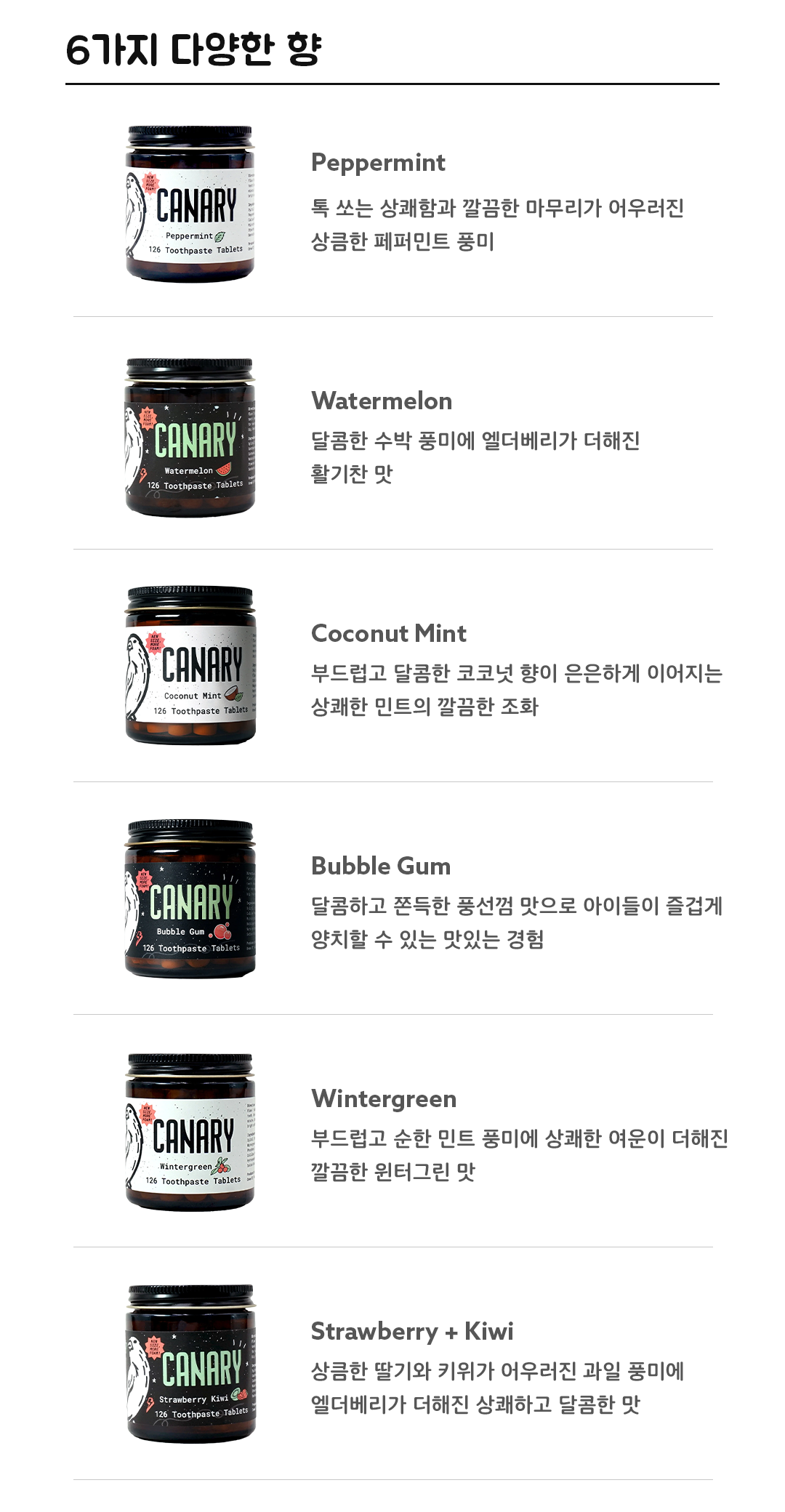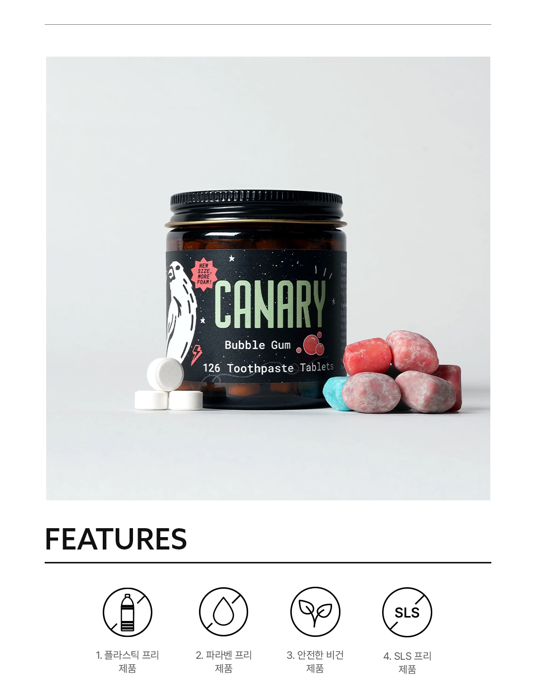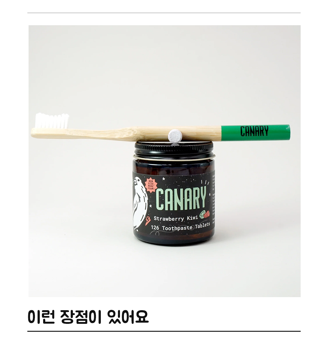 Canary Clean Co.의 치약 정제는 플라스틱 튜브 없이 칫솔질이 가능한 친환경 대안으로, 입에 넣고 씹어서 거품을 만들어 사용하는 신개념 구강 케어 제품입니다.