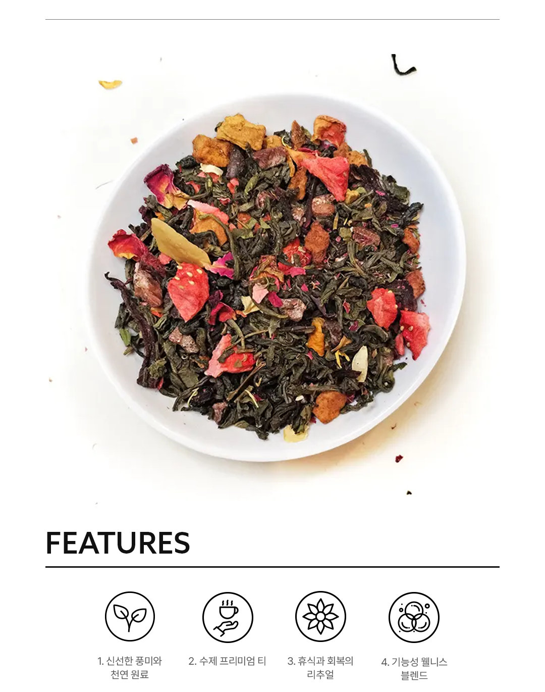 주요 효능: 체리, 비트루트, 아몬드에 함유된 트립토판, 카카오 닙의 트립토판과 세로토닌, 자스민 그린티의 L‑테아닌 성분이 도파민 생성 증가까지 도움을 주는 ‘기분 부스팅’ 효과가 강조된 티입니다.