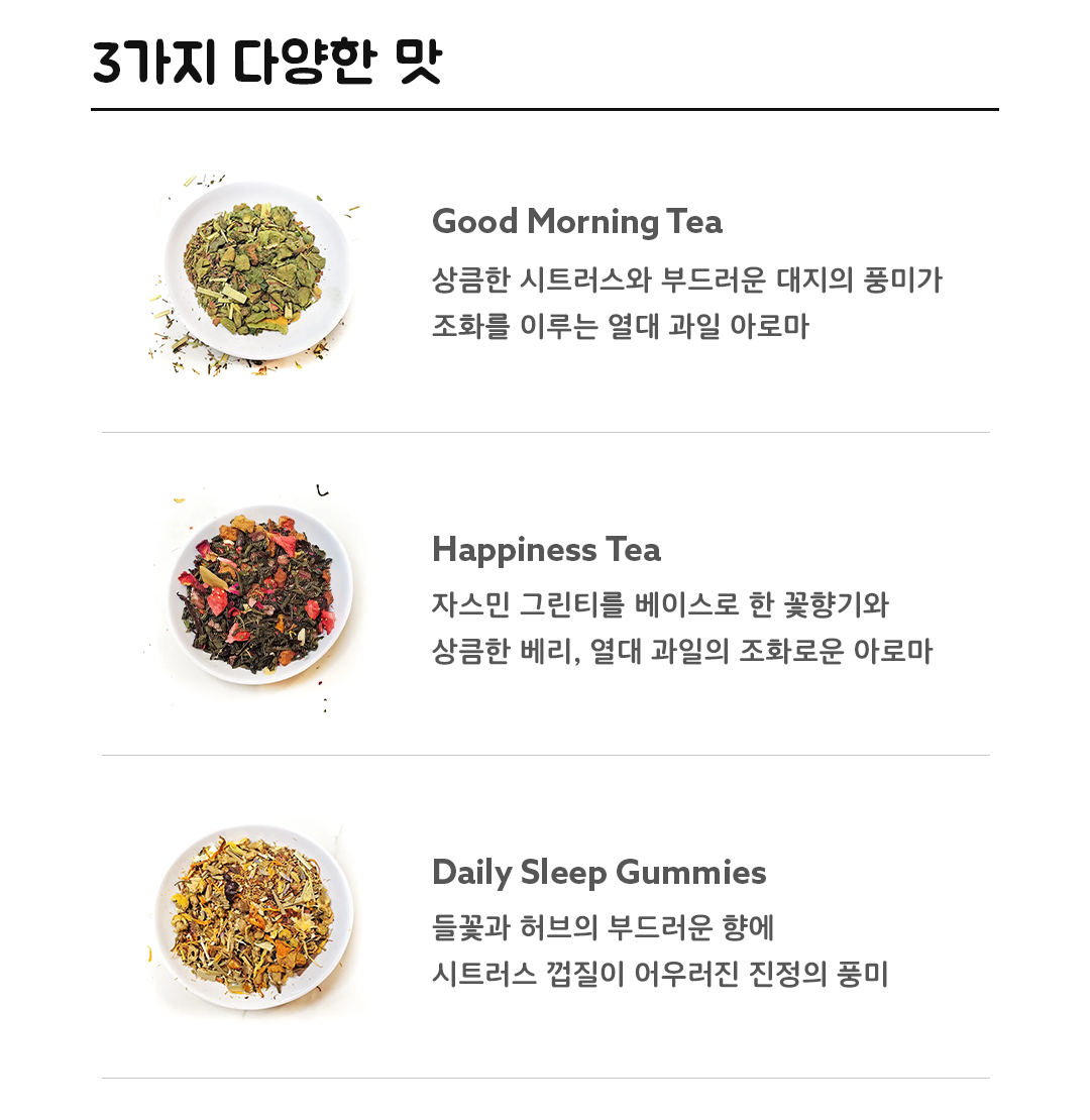 면역력 강화, 스트레스 해소, 소화 개선 등 다양한 필요에 맞는 블렌드를 선택할 수 있어 나만의 티 테라피를 시작하기에 제격입니다.