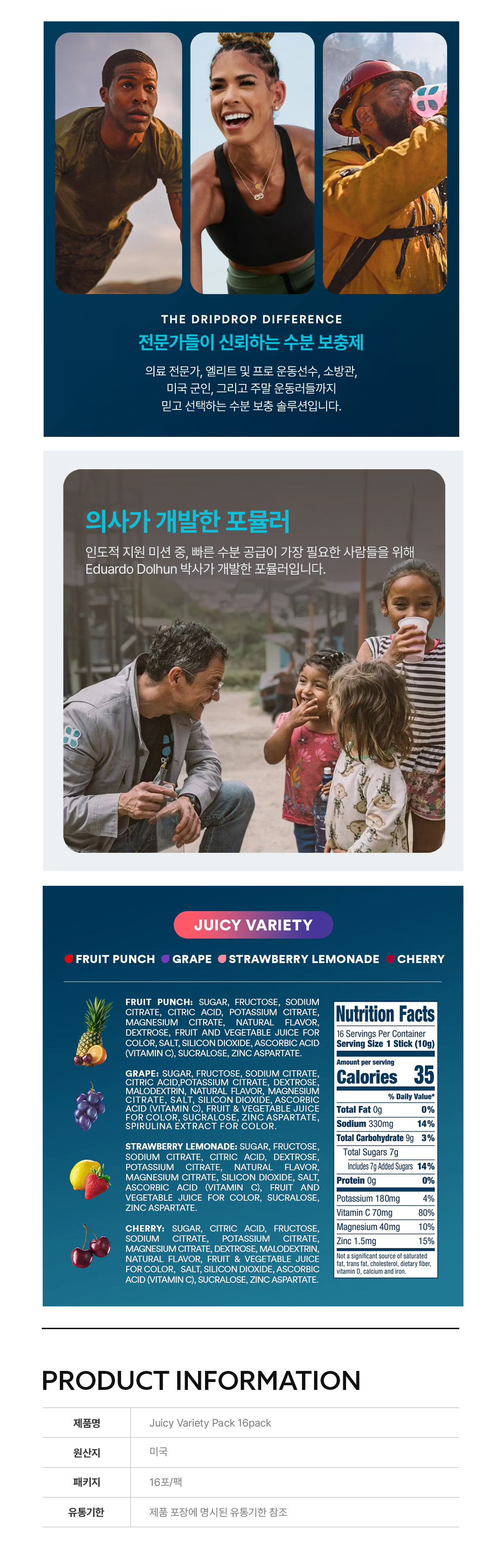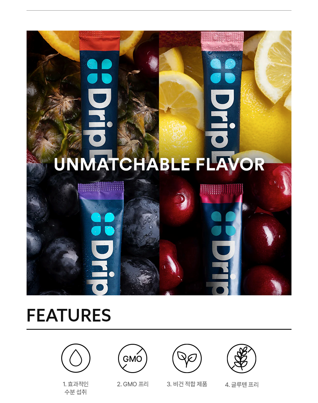 단순한 스포츠음료가 아닌 의학적 근거를 토대로 한 경구수분보충요법을 일반 소비자도 쉽게 접할 수 있도록 개발된 DripDrop은 현재 의료진, 소방관, 엘리트 운동선수, 그리고 미군까지 신뢰하는 전문 수분 보충 솔루션으로 자리잡았습니다.