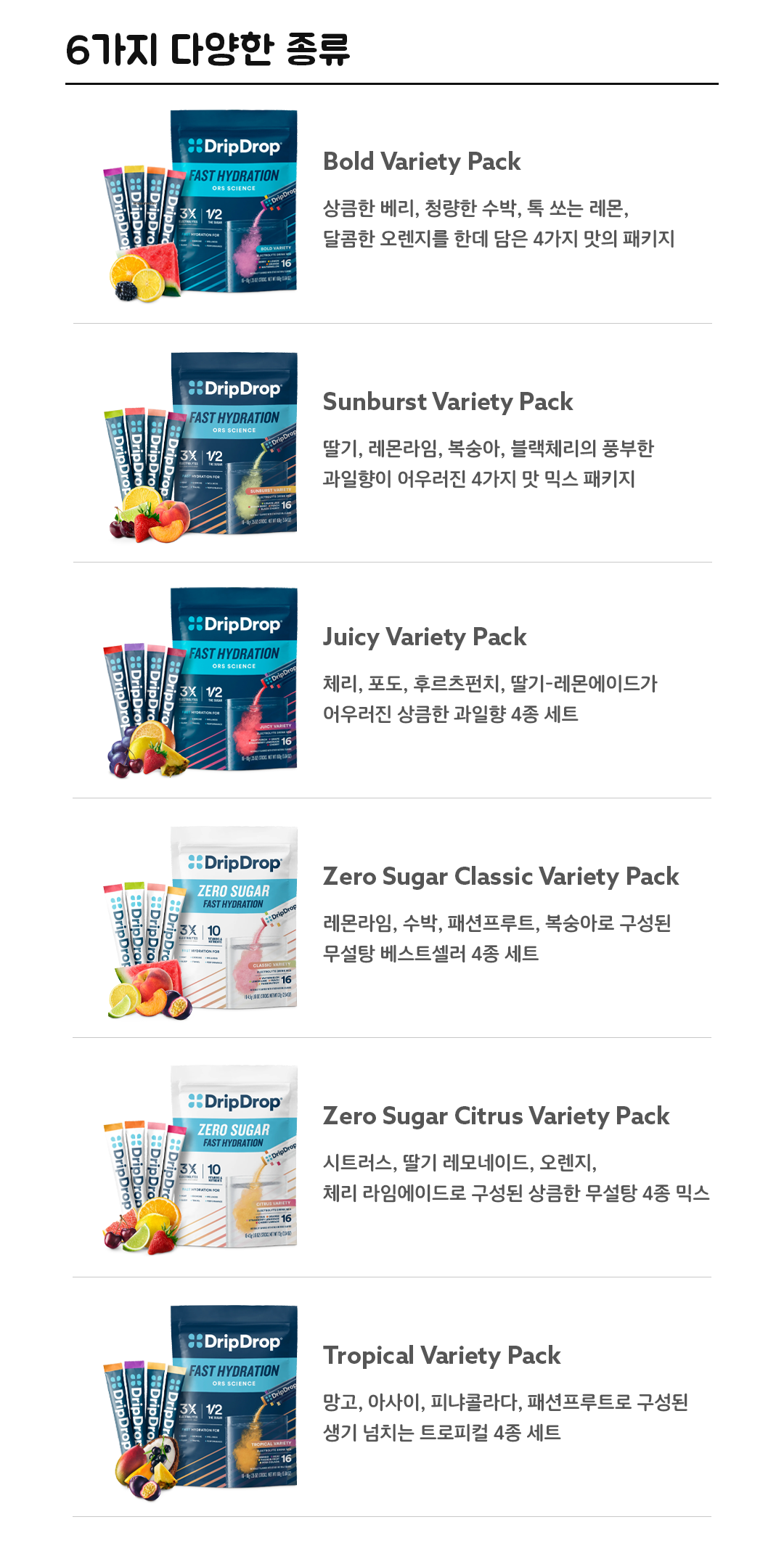 DripDrop Electrolyte Drink Mix Variety Pack은 프리미엄 수분 보충 솔루션입니다.