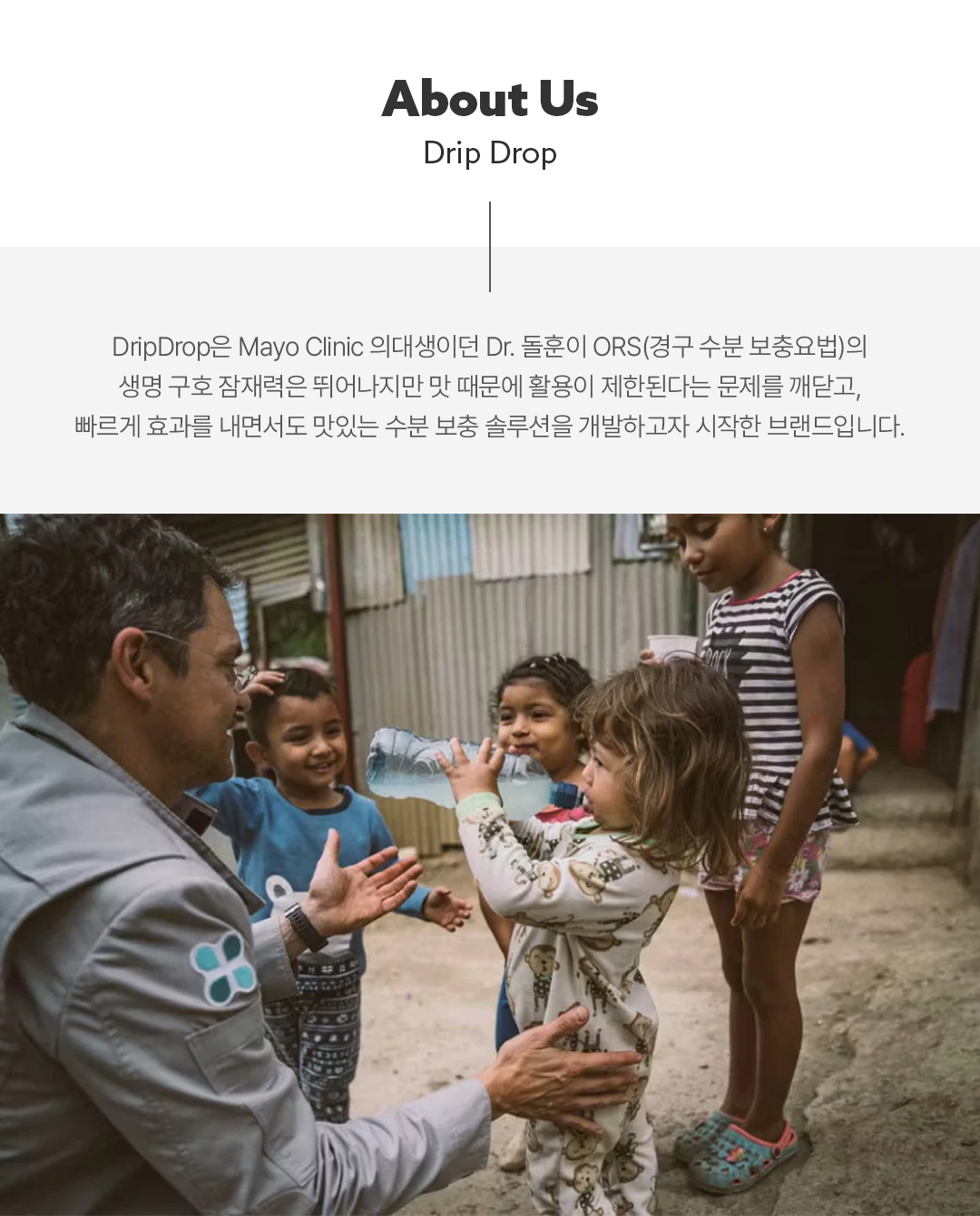 DripDrop은 인도주의적 의료 지원 활동을 펼치던 에두아르도 돌후안 박사가 개발한 전문 탈수 솔루션 브랜드입니다.