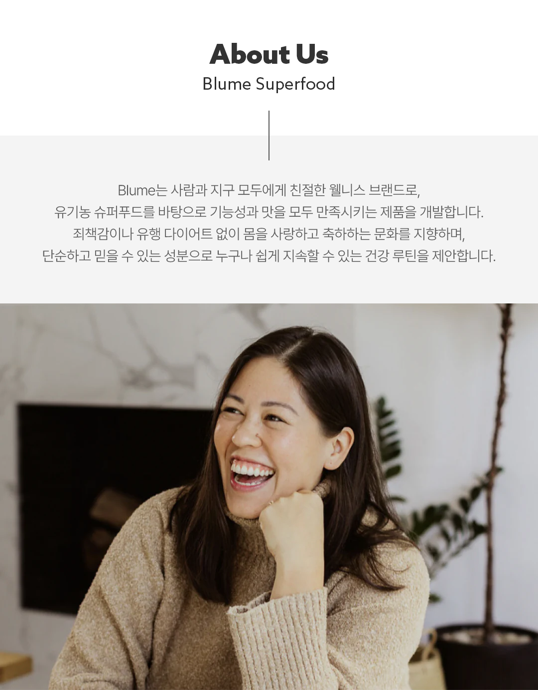 Blume는 맛과 건강을 동시에 충족시키는 슈퍼푸드 음료를 선보이는 브랜드입니다.