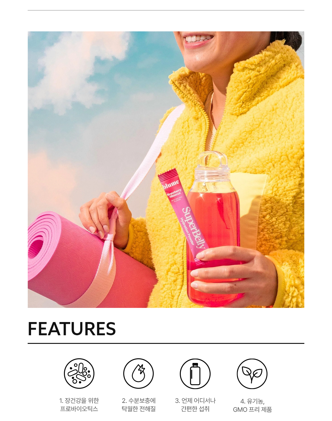 유기농 과일과 슈퍼푸드로 만들어진 4가지 맛의 SuperBelly는 건강한 장내 세균총 형성을 돕고, 소화 건강과 면역력 향상을 지원하며, 단백질 이용률까지 높여주는 올인원 기능성 음료입니다.