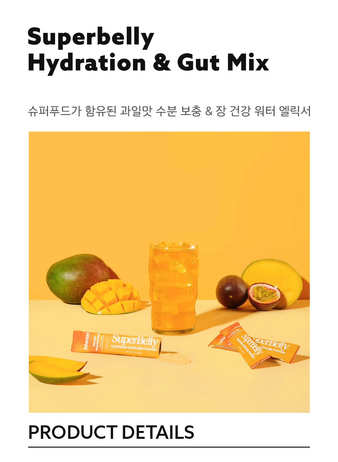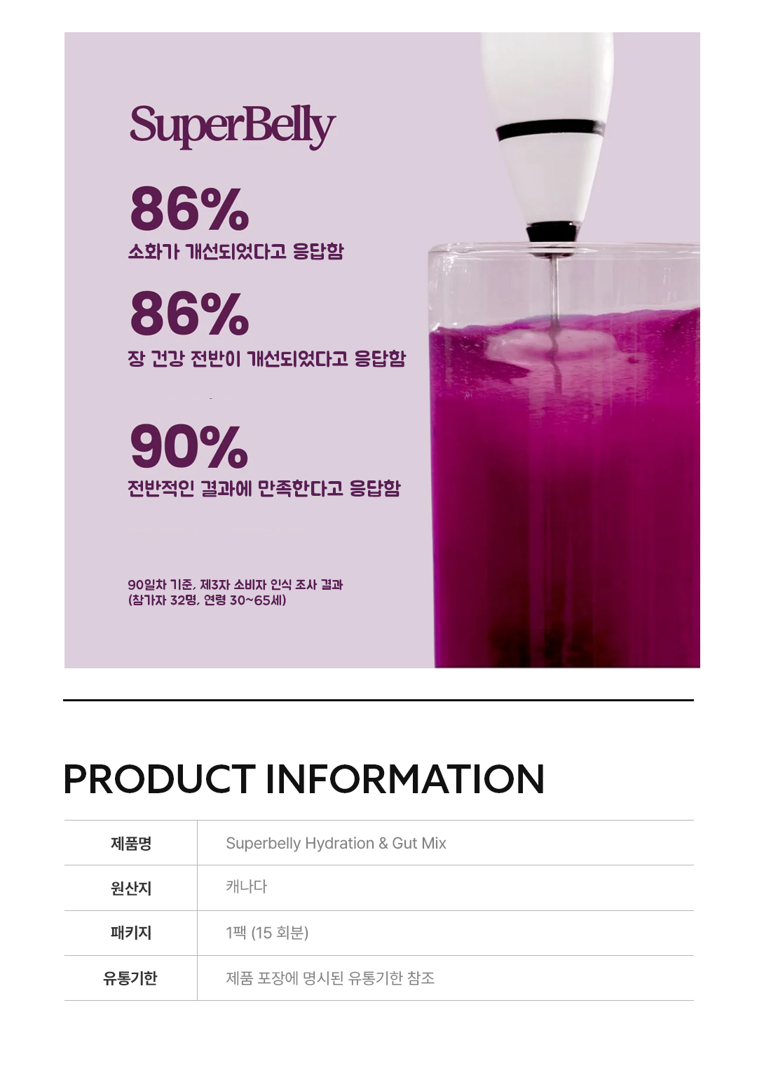 SuperBelly는 장 건강과 수분 공급을 동시에 지원하는 프리미엄 하이드레이션 드링크 믹스입니다.