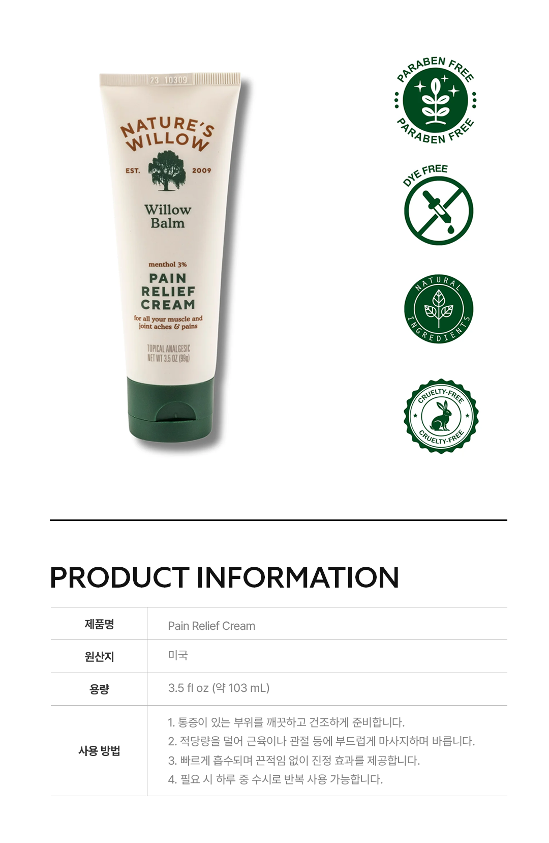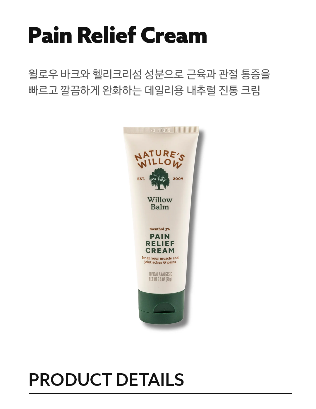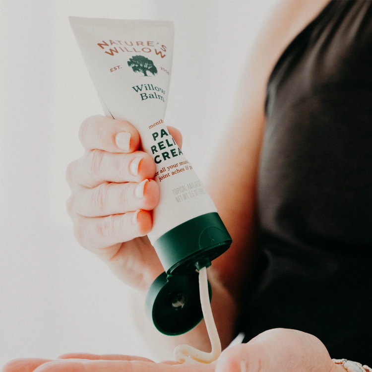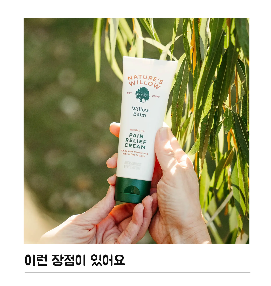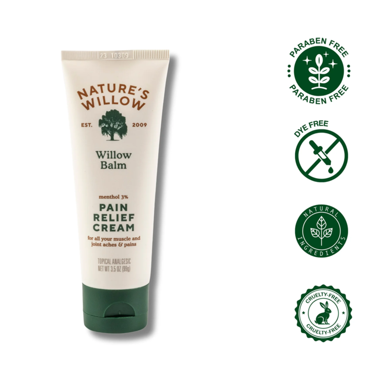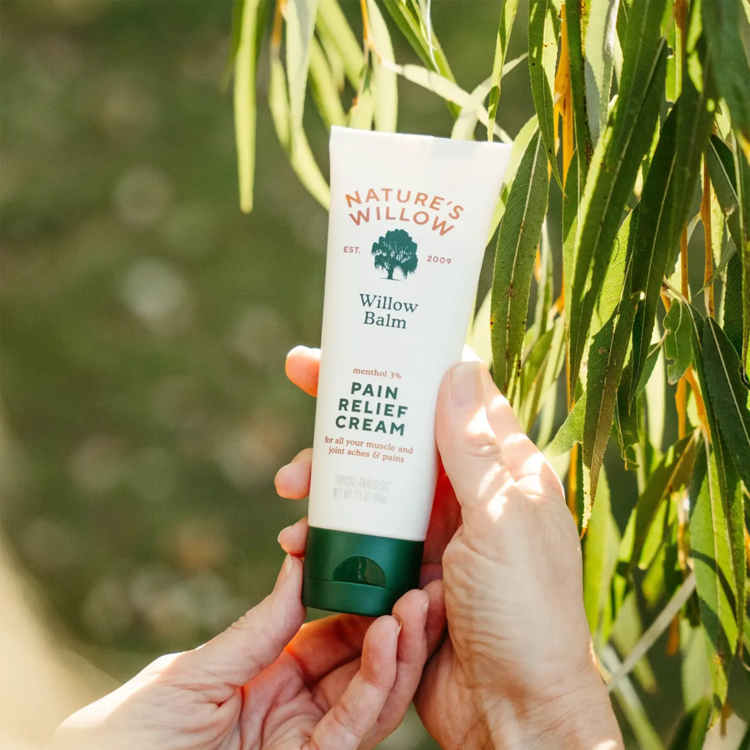 Willow Balm Pain Relief Cream은 버드나무 껍질에서 추출한 살리신과 이모르뗄을 주성분으로 한 천연 통증 완화 크림입니다.