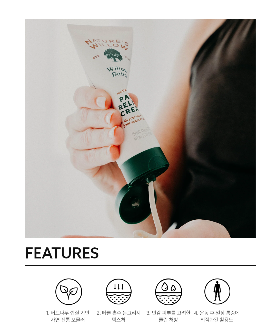 Willow Balm Pain Relief Cream은 뭉친 근육, 쑤시는 관절, 오래 서 있던 날의 불편감처럼 일상에서 반복되는 통증 고민을 빠르고 집중적으로 케어하도록 제조된 마사지 크림입니다.