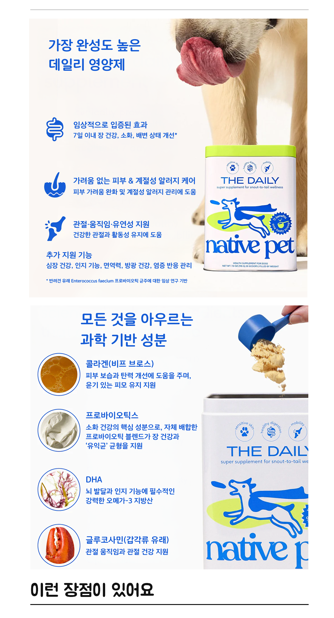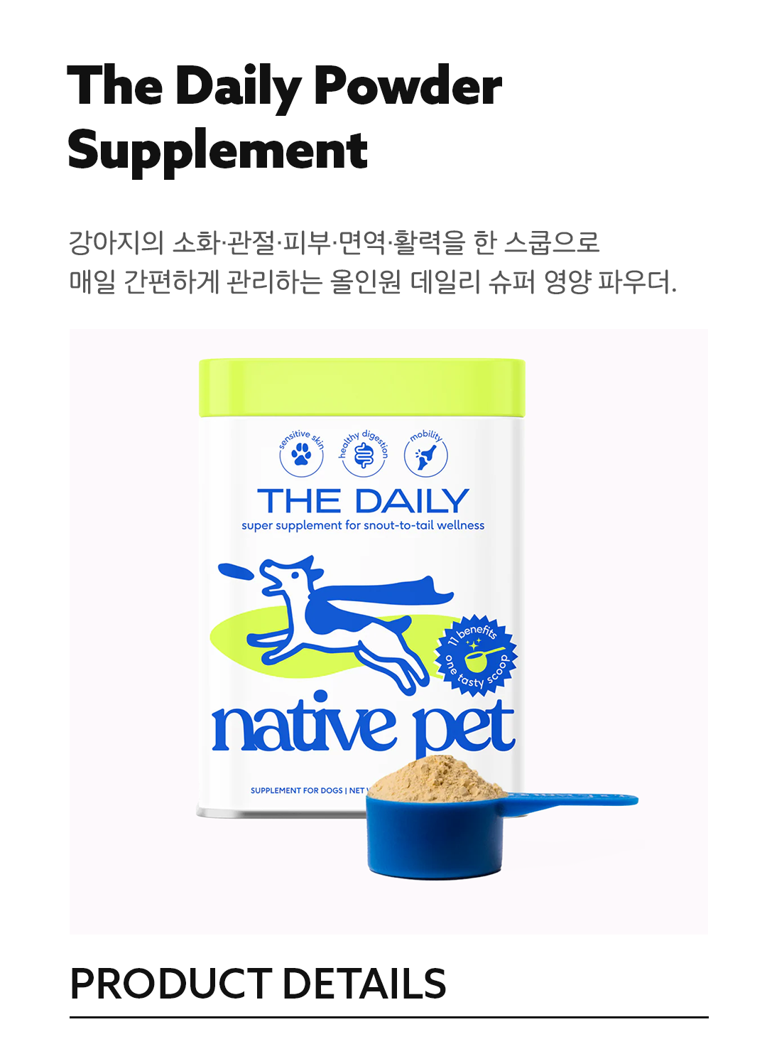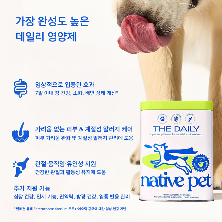 The Daily는 Native Pet의 베스트셀러 제품으로, 반려견의 건강 관리를 하루 한 번으로 완성할 수 있는 종합 영양 보충제입니다.