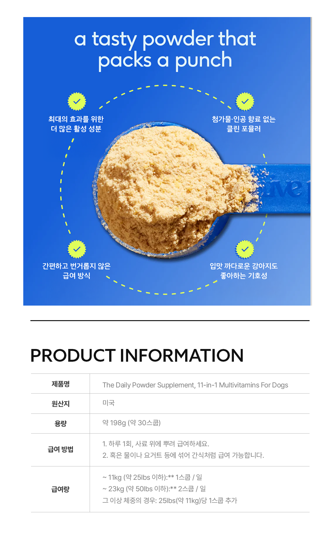가루 타입이라 사료 위에 뿌리기만 하면 편하게 챙길 수 있습니다.