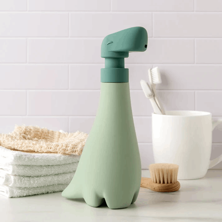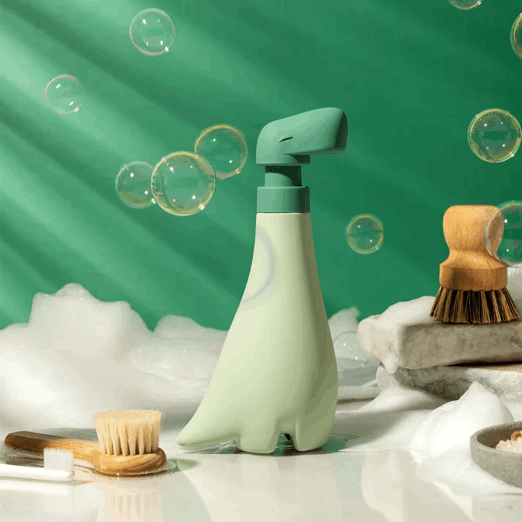 Soapasaurous는 공룡을 모티프로 한 손 세정용 디스펜서로, 세제를 담고 펌프할 때마다 공룡의 목 부분이 움직이듯 사용자에게 다정한 반응을 전합니다.