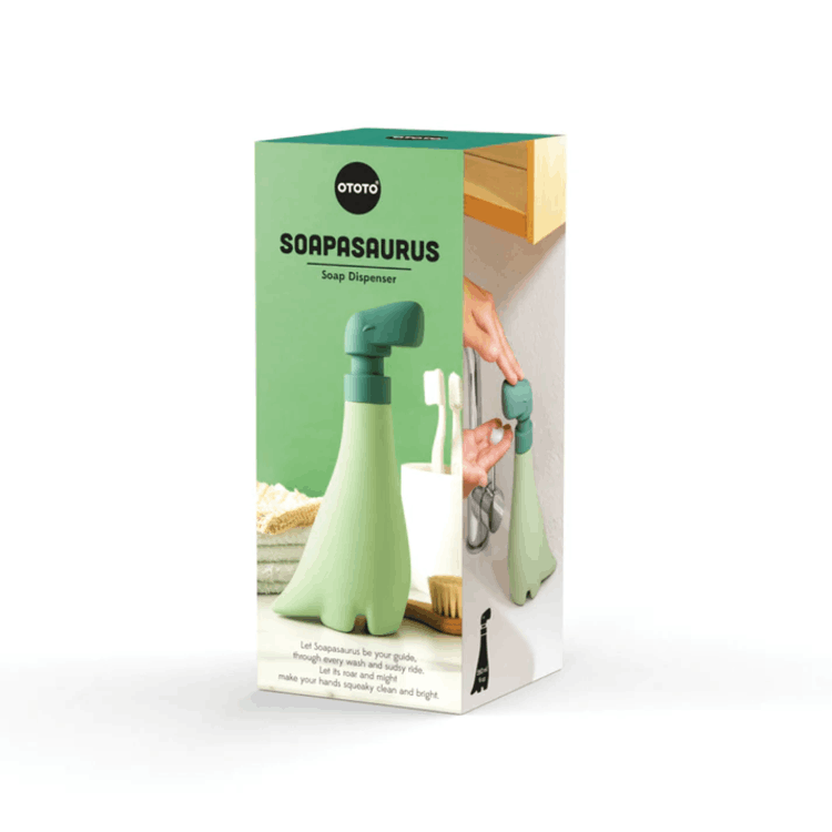 평범한 손 씻기 시간을 선사시대 모험으로 바꿔주는 Soapasaurous는 사랑스러운 초록색 공룡 모양의 비누 디스펜서입니다.