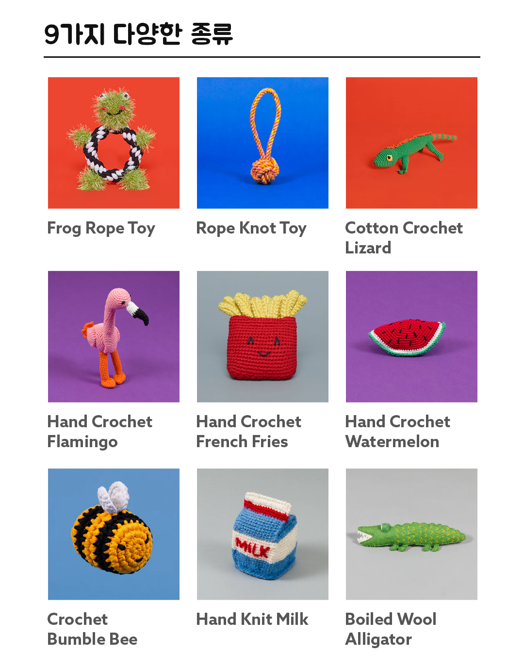 각 장난감은 장인의 손으로 하나씩 제작되며, 부드러운 소재와 재미있는 캐릭터 디자인이 결합되어 반려견의 흥미를 자연스럽게 끌어냅니다.
