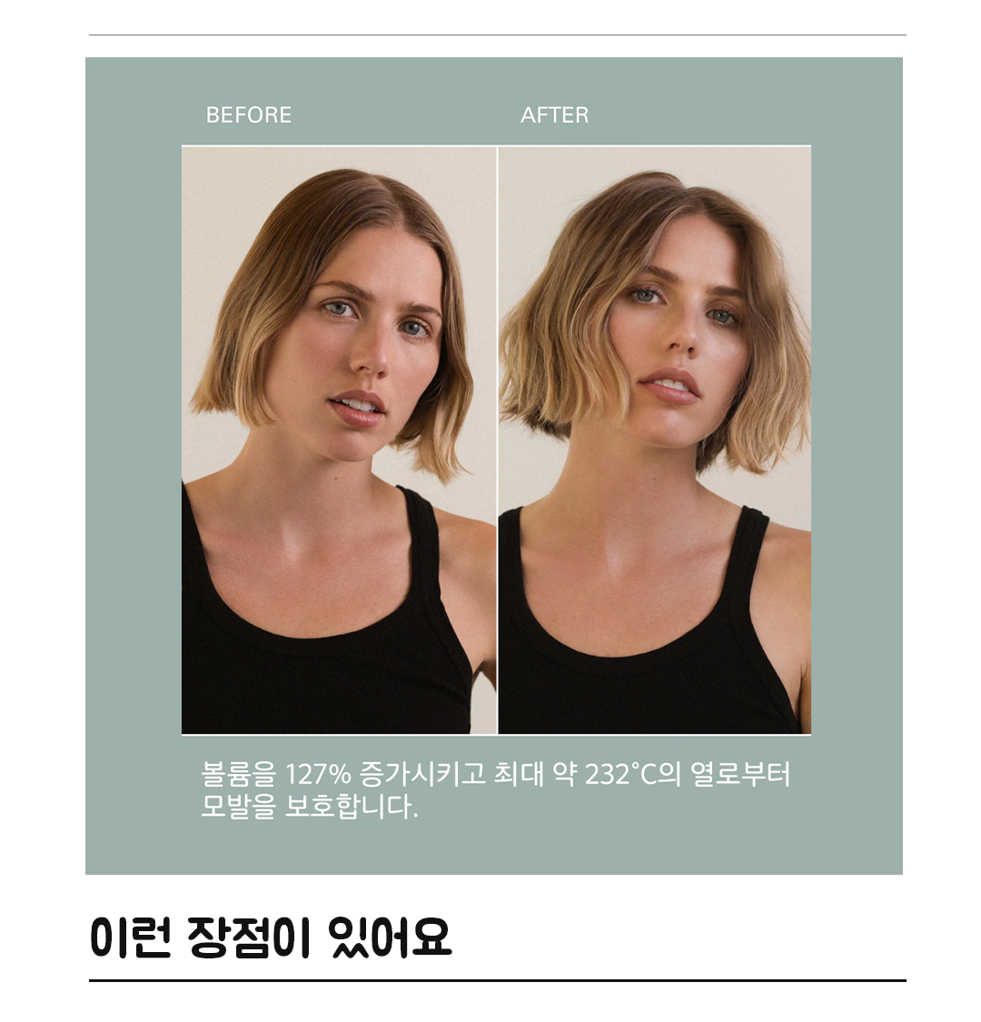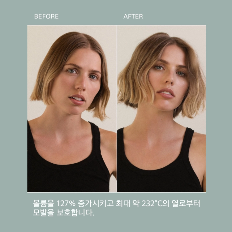 임상 연구를 통해 볼륨 127% 향상이 입증되었으며, 최대 450°F(약 232°C)의 열로부터 모발을 보호합니다.