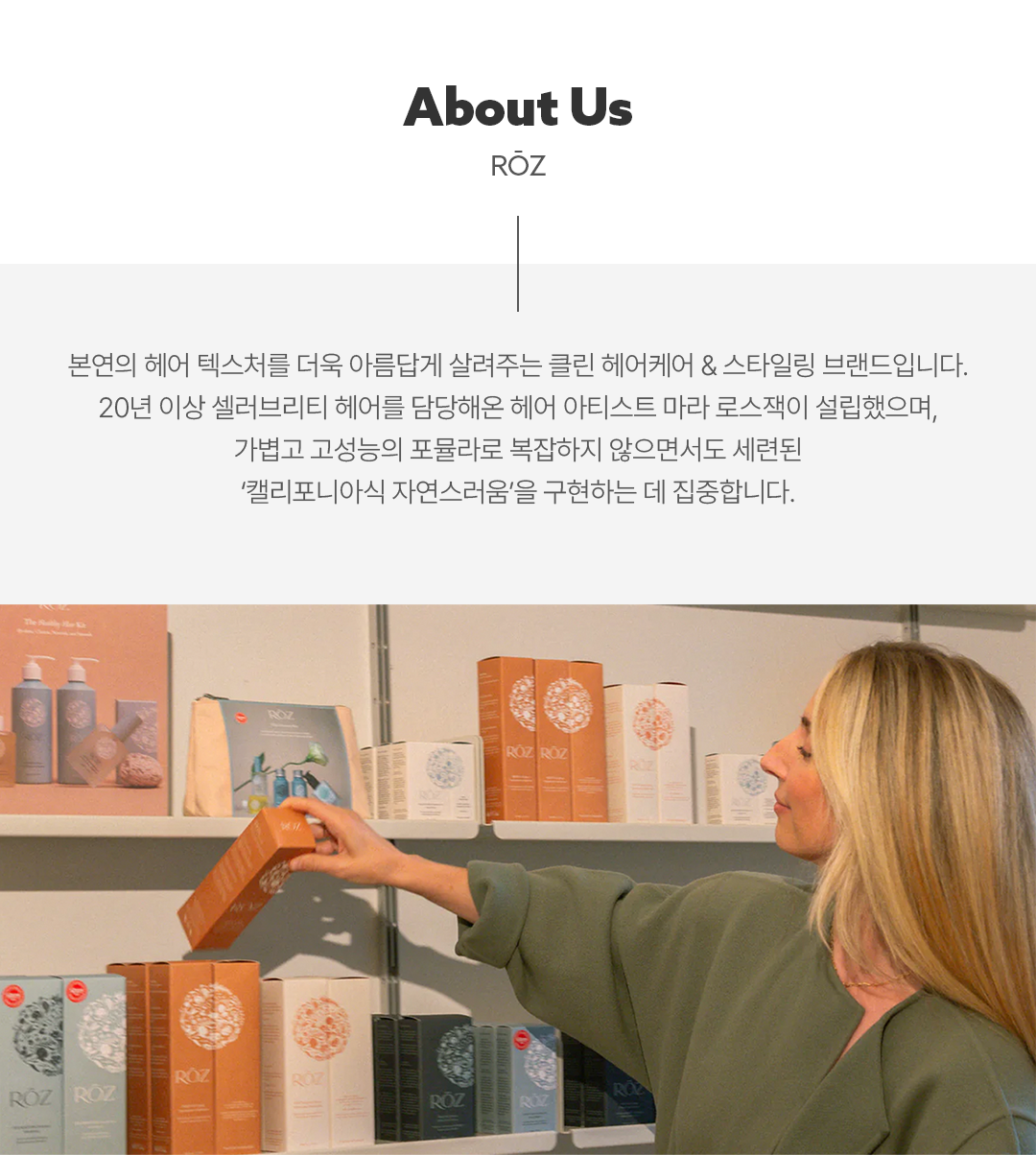 RŌZ(로즈)는 할리우드를 대표하는 헤어 스타일리스트 마라 로스작(Mara Roszak)이 창립한 프리미엄 헤어케어 브랜드입니다.