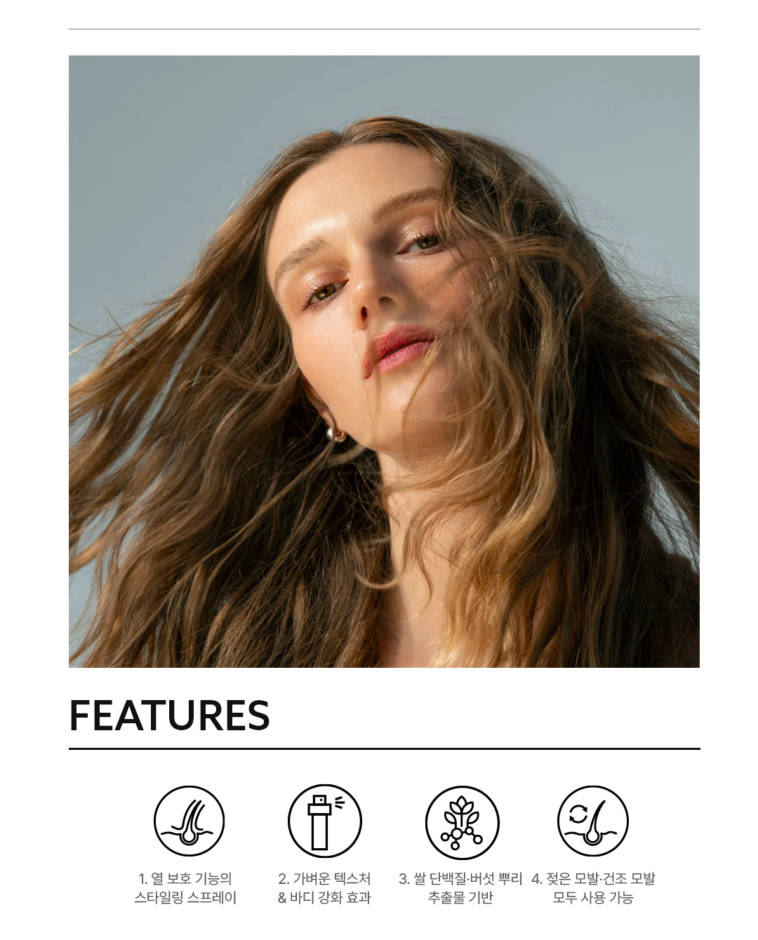 마른 모발에 가볍게 뿌려주면 텍스처 강조와 스타일 회복이 가능합니다.