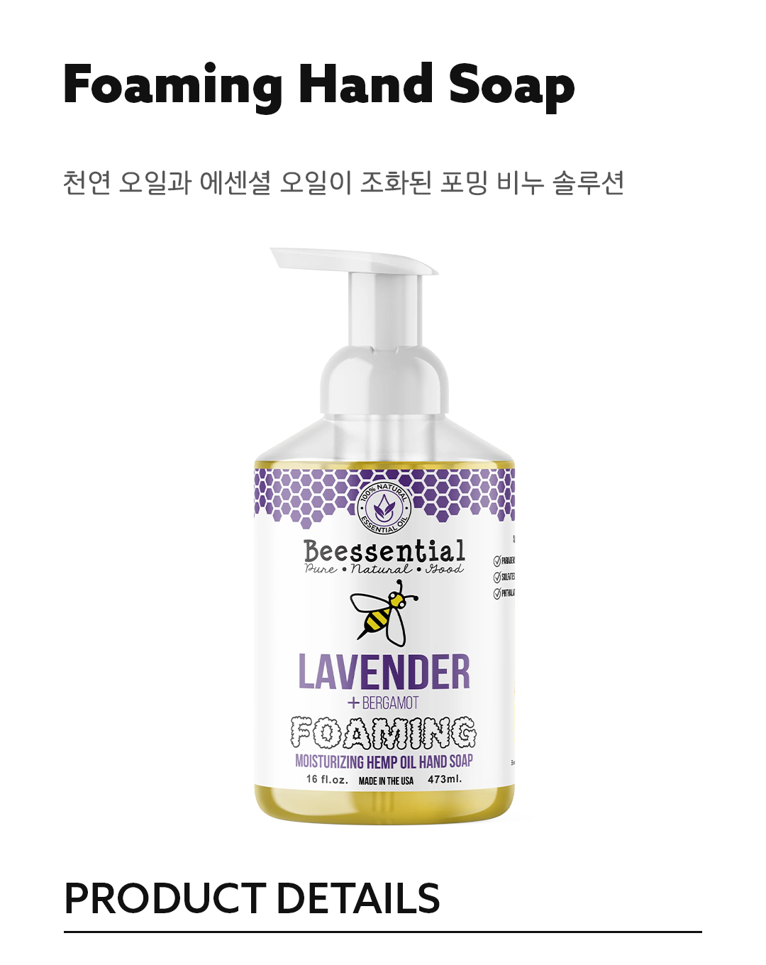 Beessential Foaming Hand Soap 16oz는 천연 허니와 에센셜 오일의 조화로 탄생한 프리미엄 폼 핸드솝입니다.