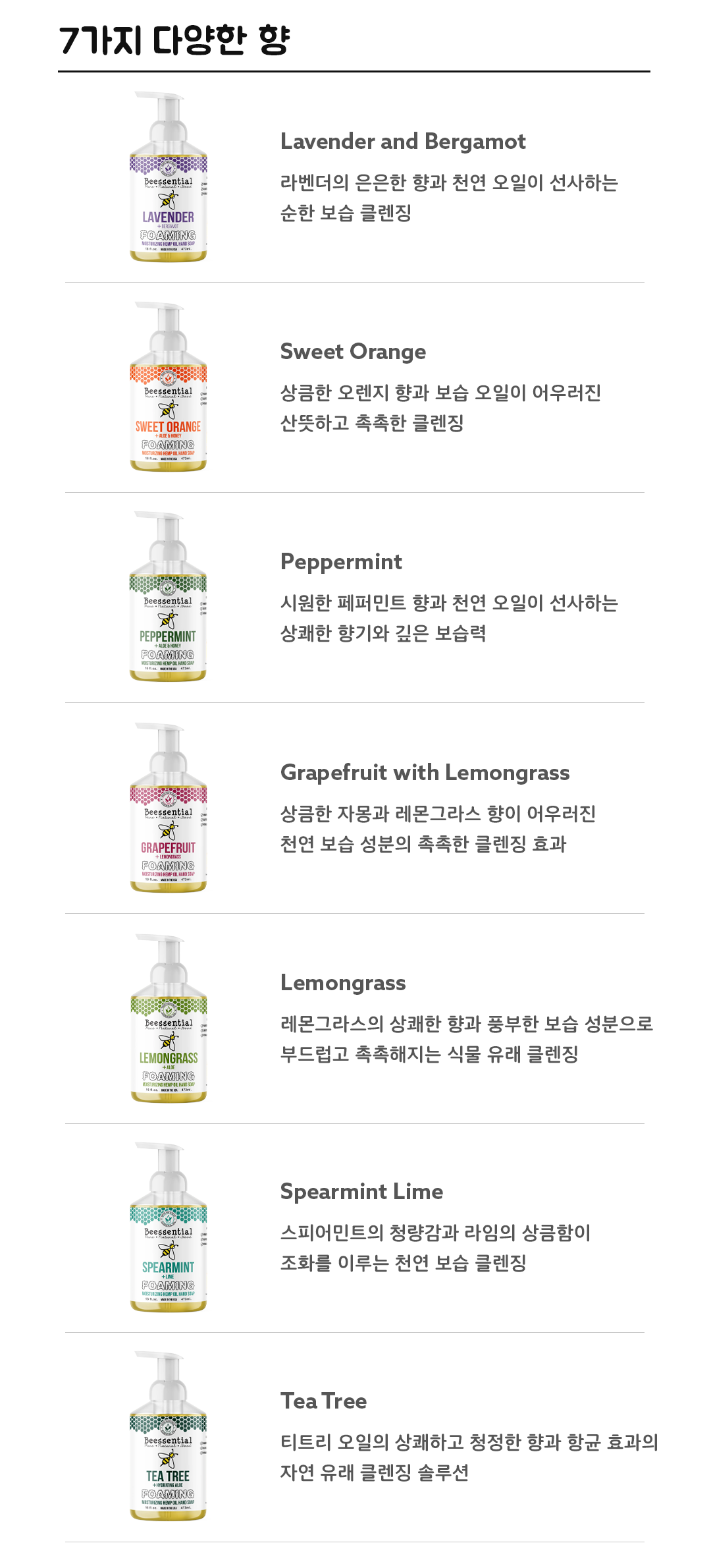Beessential Foaming Hand Soap 16 oz(약 473 ml) 시리즈는 총 7가지 향으로 구성되어 있습니다.
