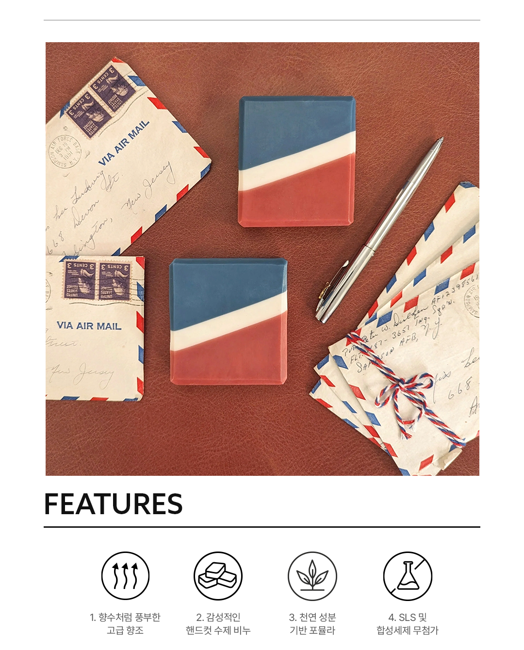 각 비누는 빈티지 여행 엽서에서 영감을 받은 독창적인 디자인과 커스텀 블렌딩된 향으로, 마치 시간여행을 하듯 특별한 순간들을 연상시킵니다.