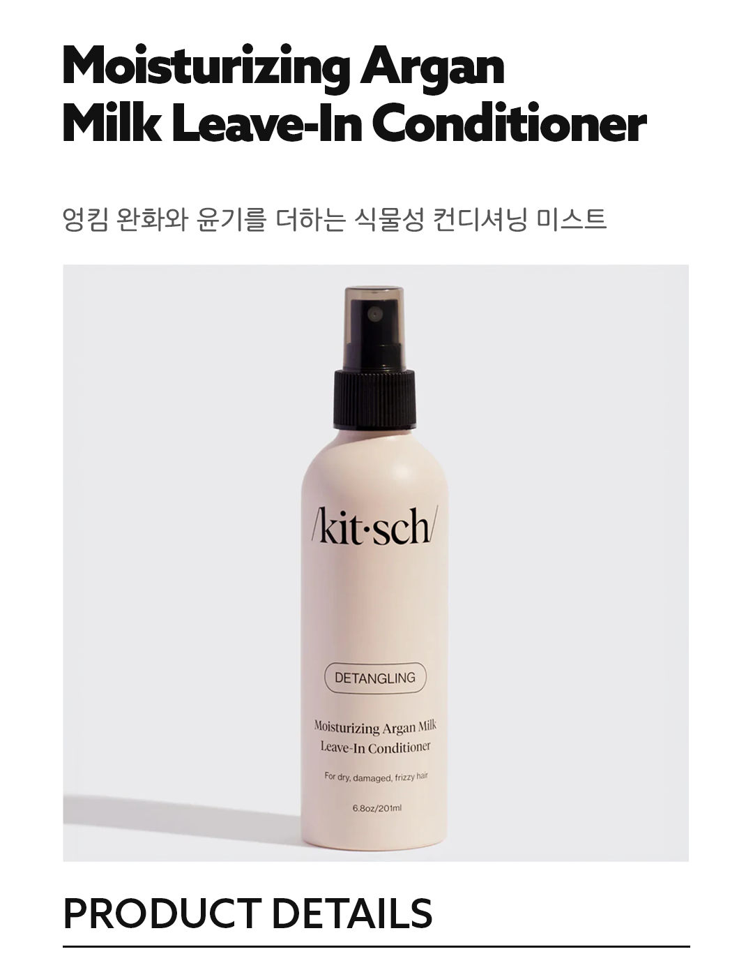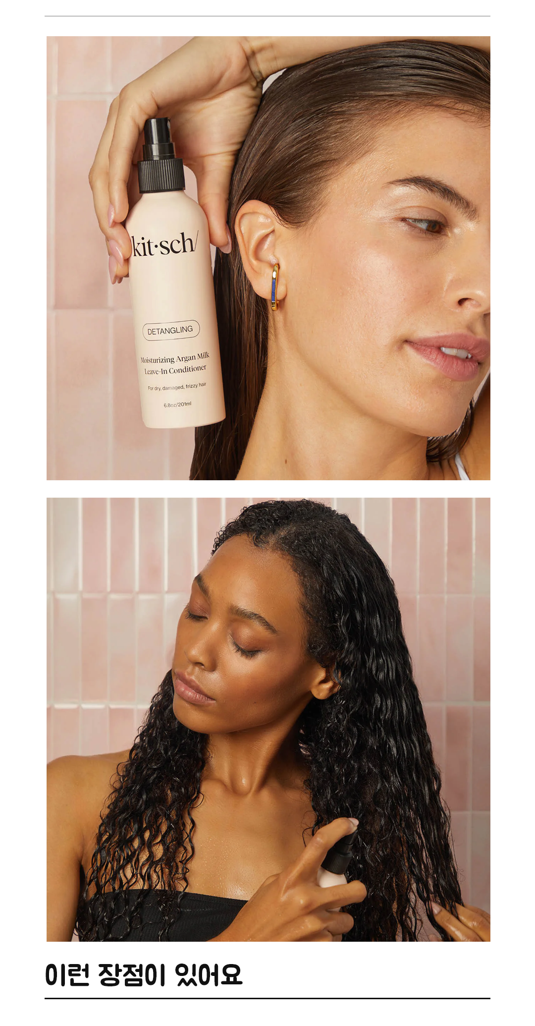 바쁜 현대 여성의 일상을 위해 개발된 Kitsch의 Moisturizing Argan Milk Leave-in Conditioner는 젖은 모발과 마른 모발 모두에 사용 가능한 혁신적인 리브인 컨디셔너입니다.