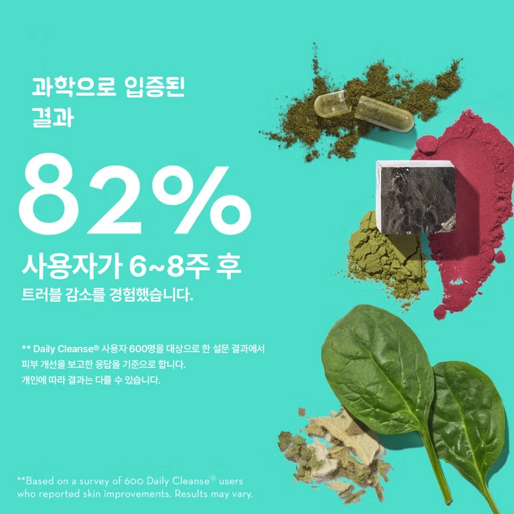 Daily Cleanse는 순한 클렌즈 제품입니다. 다만 신체가 새로운 보충제에 적응하는 과정에서 일시적으로 트러블이 약간 증가할 수 있습니다.