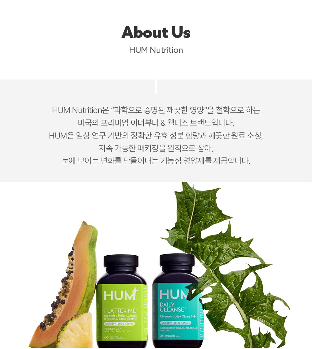 2012년 미국에서 설립된 HUM Nutrition은 피부, 모발, 바디, 무드 등 여성의 다양한 건강 고민을 영양학적 접근으로 해결하는 웰니스 브랜드입니다.