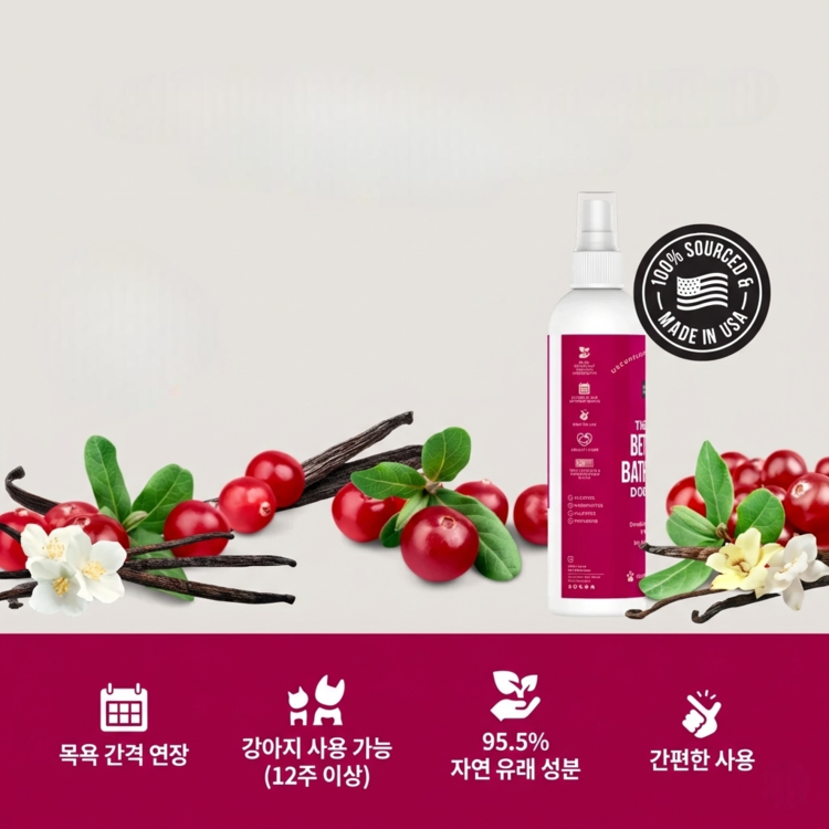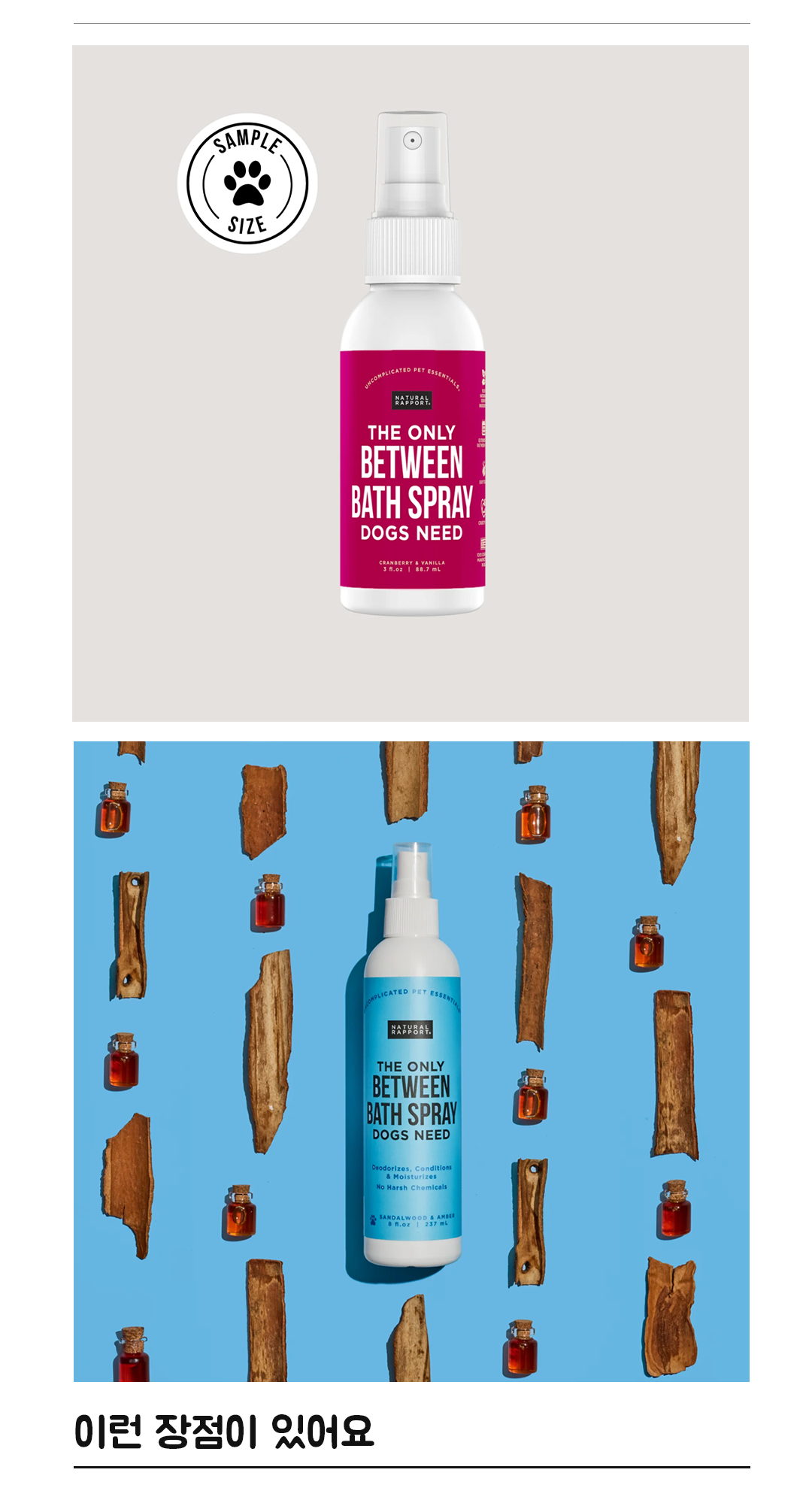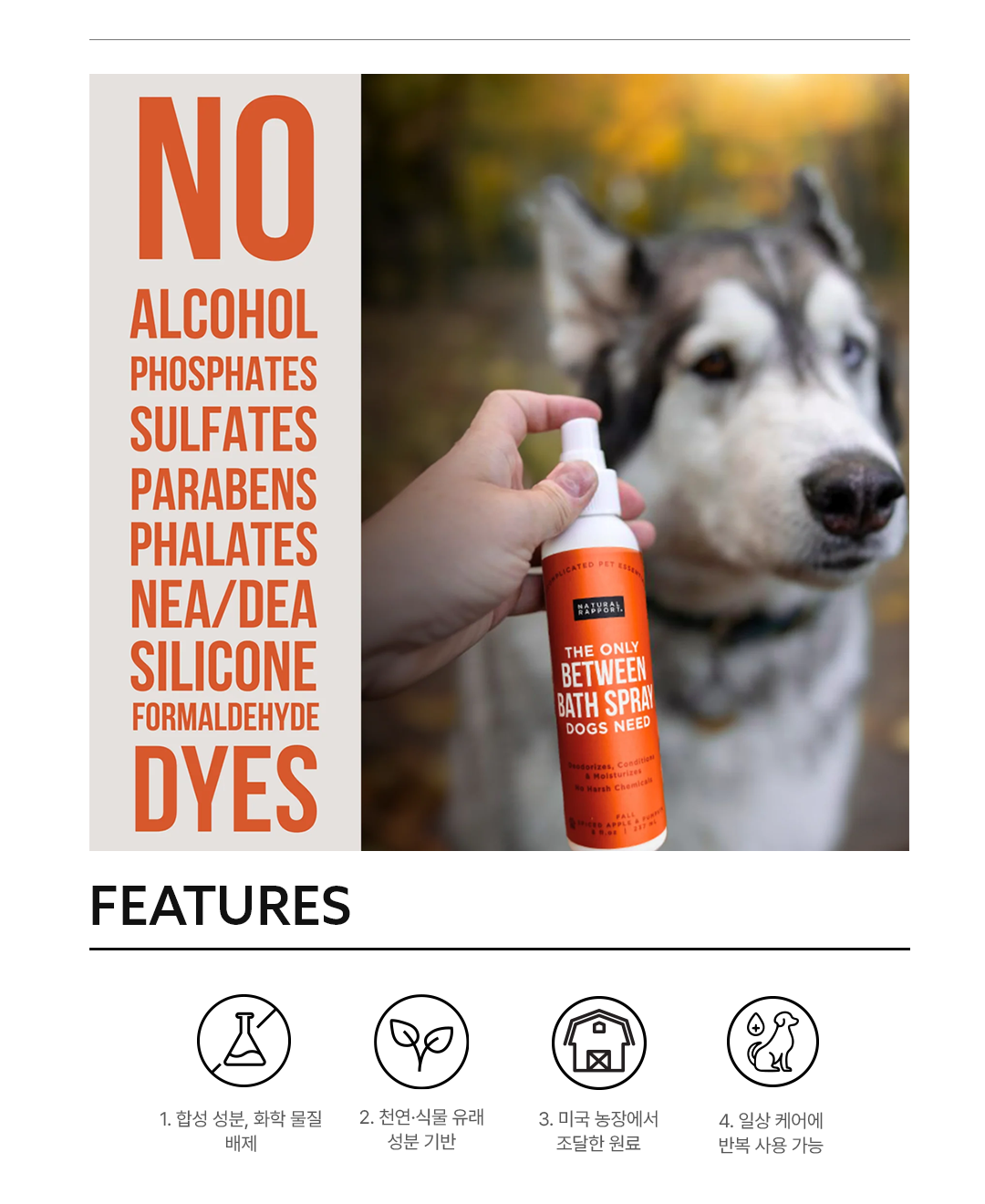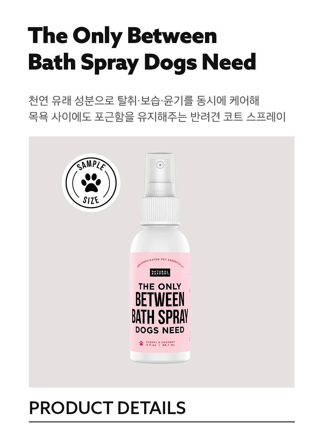 The Only Between Bath Spray Dogs Need는 목욕 사이, 강아지의 털과 냄새가 신경 쓰이는 순간에 가볍게 뿌려 탈취(Deodorizing)·보습(Moisturizing)·컨디셔닝(Conditioning)을 한 번에 돕는 미스트 타입 스프레이입니다.